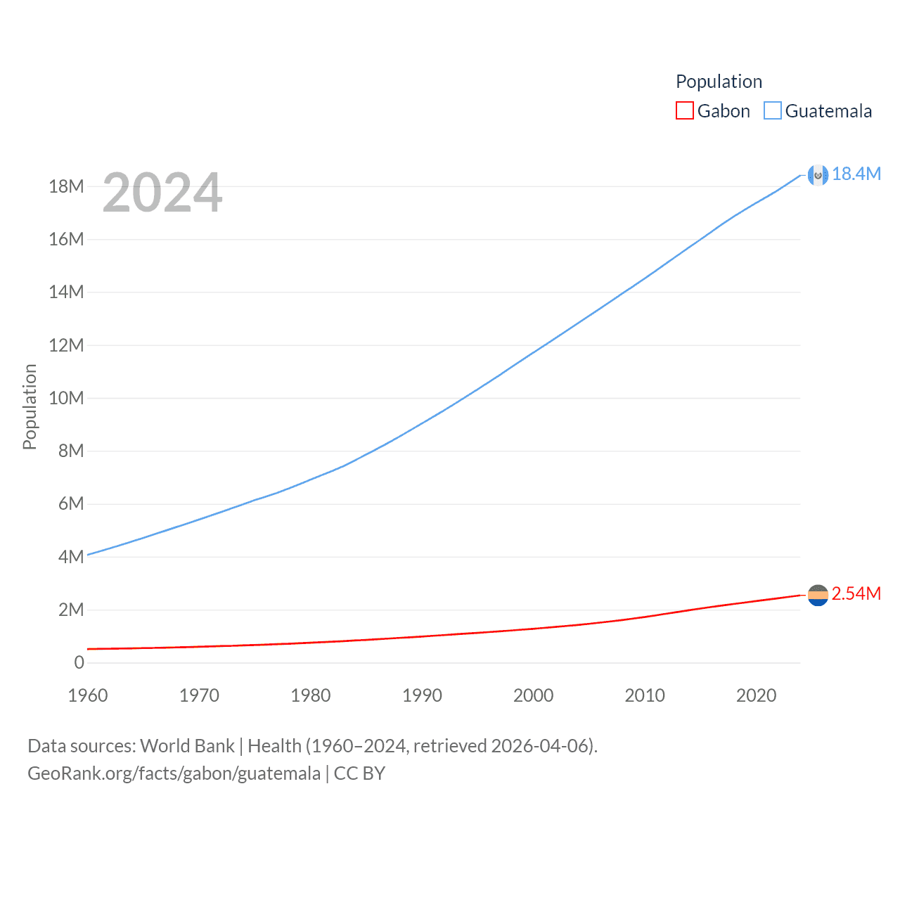 Gabon has a population of 2.54M (ranked 141/197), compared with 18.4M in Guatemala (ranked 70/197). Gabon's land area is 99,487 sq mi versus 41,375 sq mi for Guatemala (ranked 75th vs. 102nd).