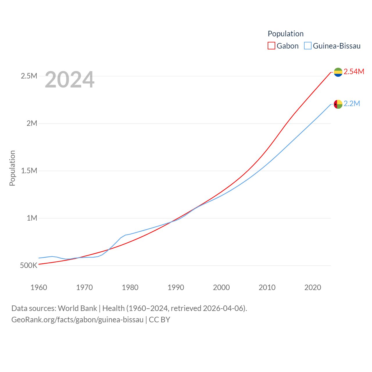 Gabon has a population of 2.54M (ranked 141/197), compared with 2.2M in Guinea-Bissau (ranked 146/197). Gabon's land area is 99,487 sq mi versus 10,857 sq mi for Guinea-Bissau (ranked 75th vs. 139th).