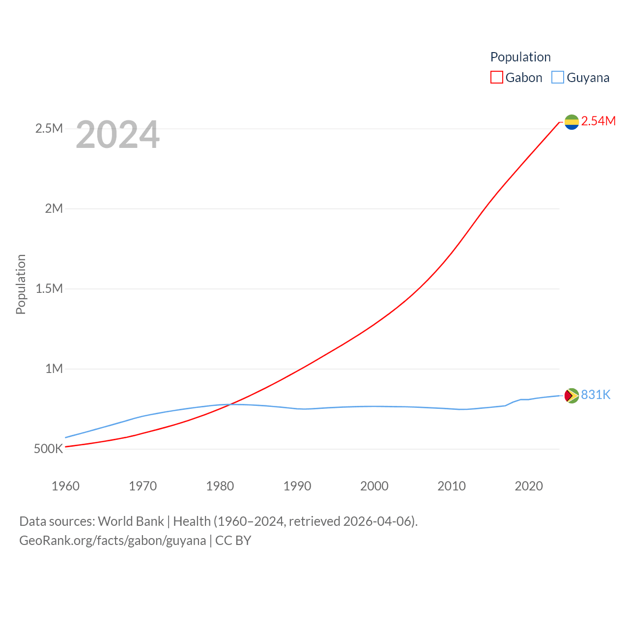 Gabon has a population of 2.54M (ranked 141/197), compared with 831K in Guyana (ranked 161/197). Gabon's land area is 99,487 sq mi versus 81,522 sq mi for Guyana (ranked 75th vs. 82nd).