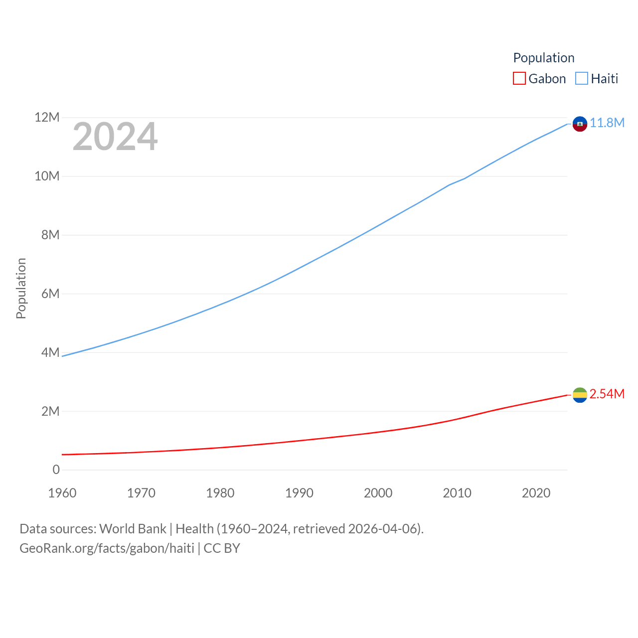 Gabon has a population of 2.54M (ranked 141/197), compared with 11.8M in Haiti (ranked 83/197). Gabon's land area is 99,487 sq mi versus 10,641 sq mi for Haiti (ranked 75th vs. 142nd).