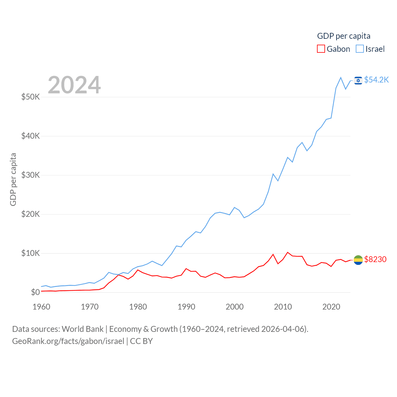 By GDP, Gabon ranks 127/197 ($20.9B) and Israel ranks 29/197 ($540B). By GDP per capita, Gabon ranks 93/197 ($8,230), while Israel ranks 21/197 ($54,177).