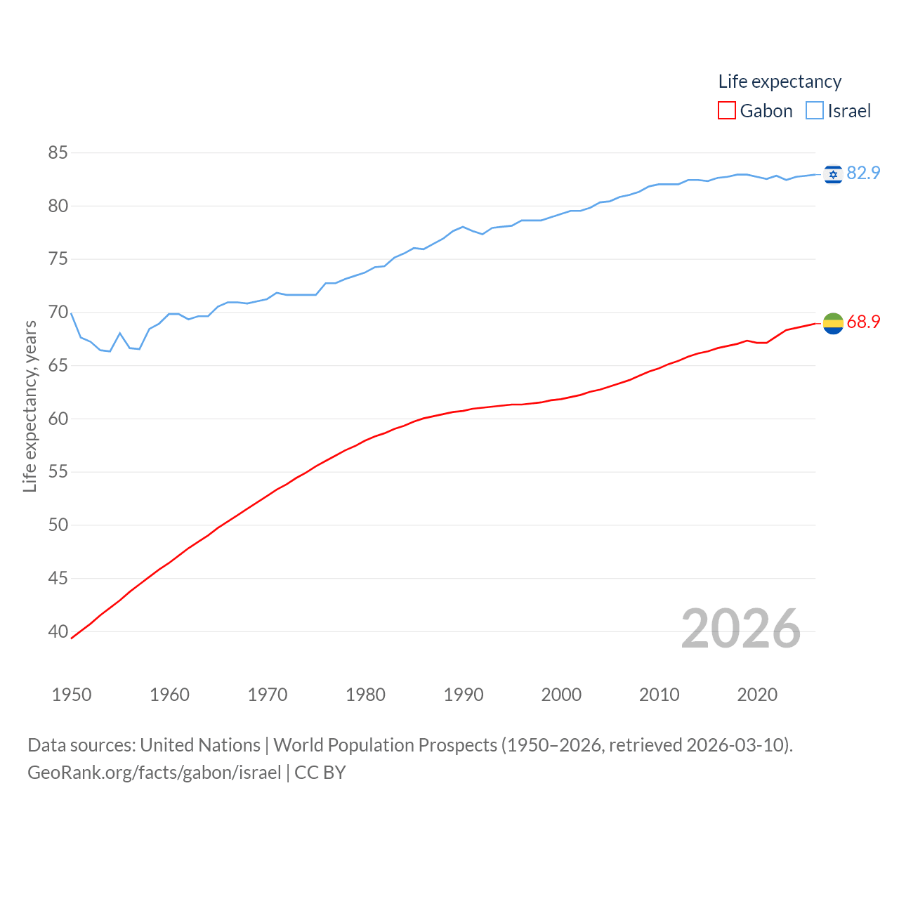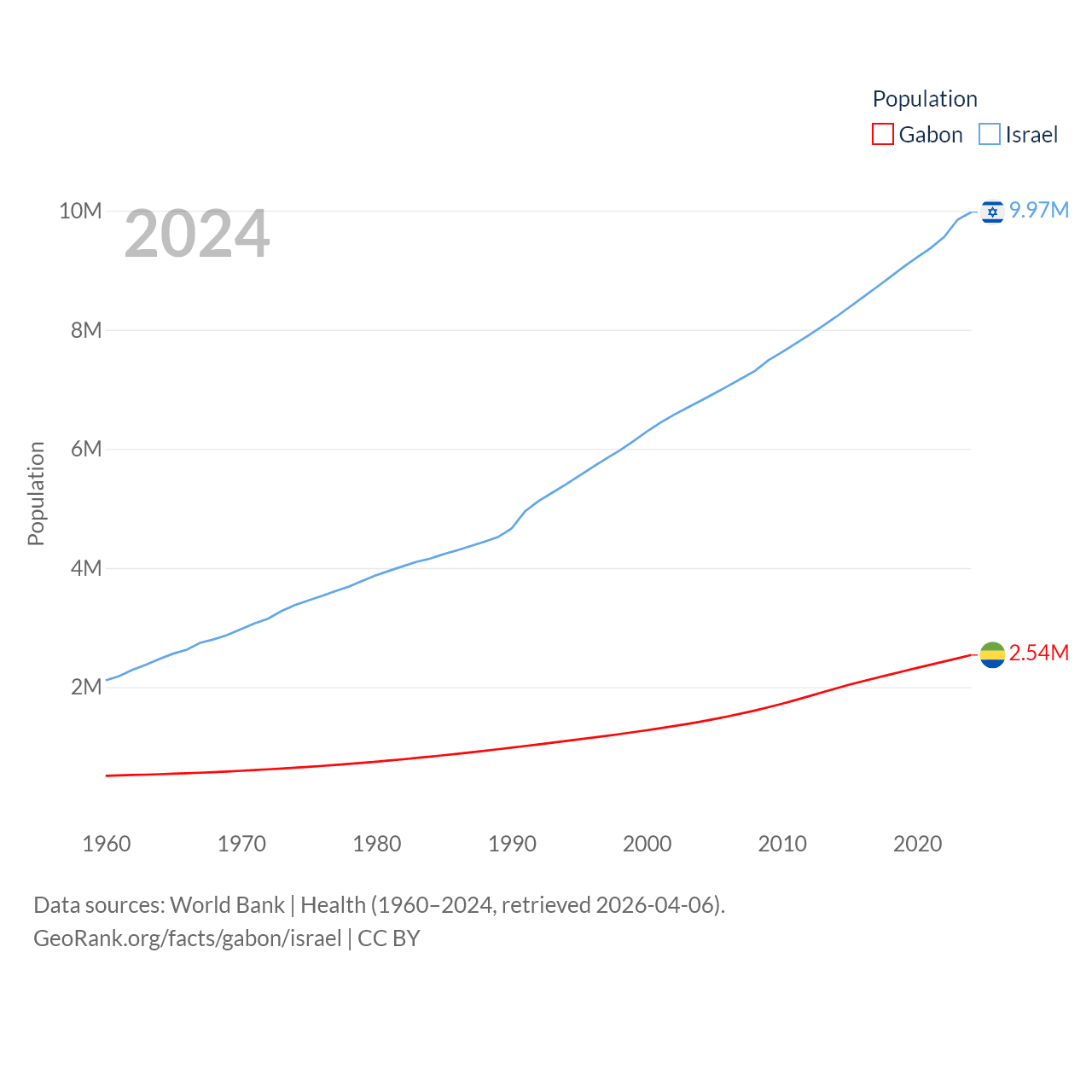 Gabon has a population of 2.54M (ranked 141/197), compared with 9.97M in Israel (ranked 96/197). Gabon's land area is 99,487 sq mi versus 8,355 sq mi for Israel (ranked 75th vs. 149th).