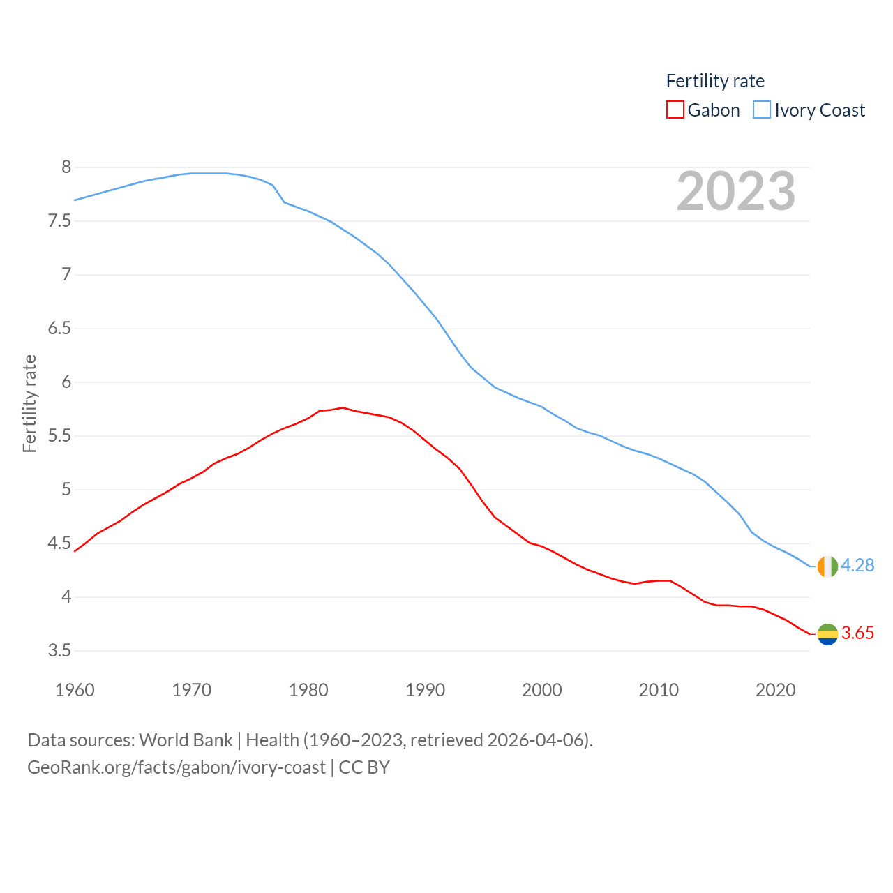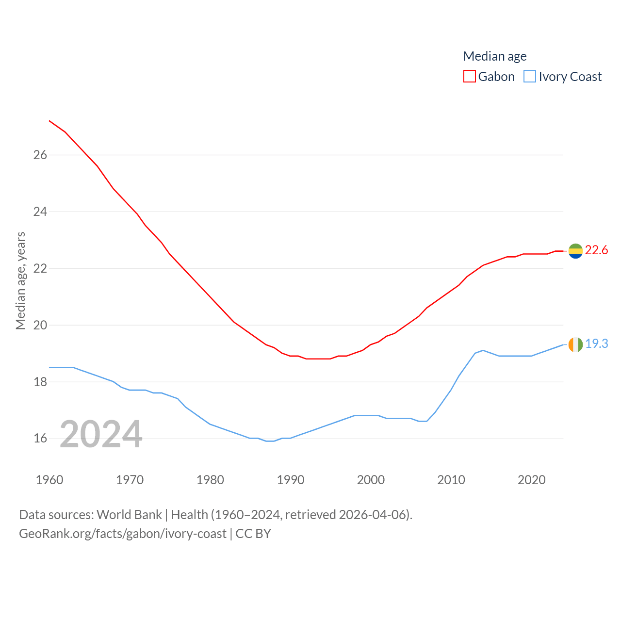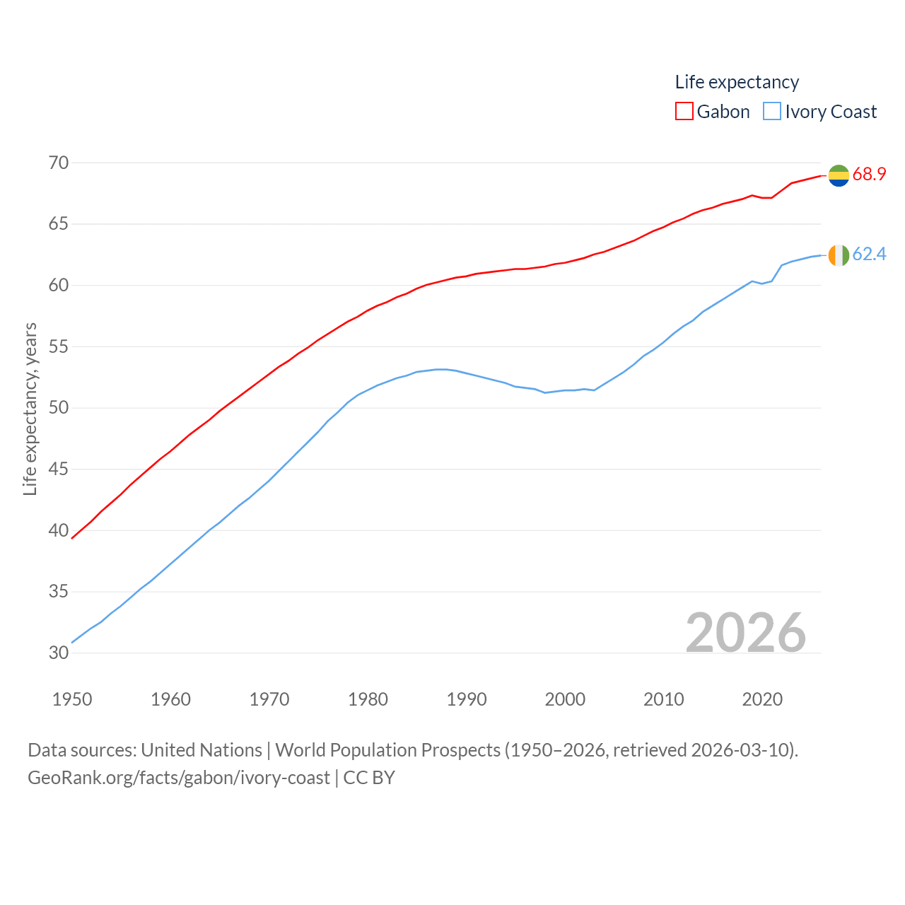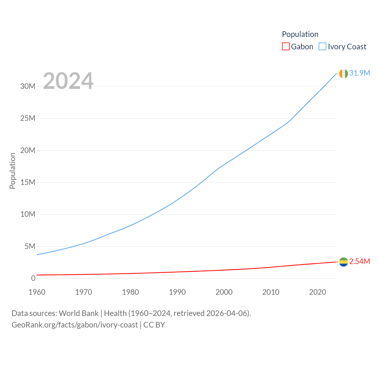 Gabon has a population of 2.54M (ranked 141/197), compared with 31.9M in Ivory Coast (ranked 50/197). Gabon's land area is 99,487 sq mi versus 122,780 sq mi for Ivory Coast (ranked 75th vs. 66th).