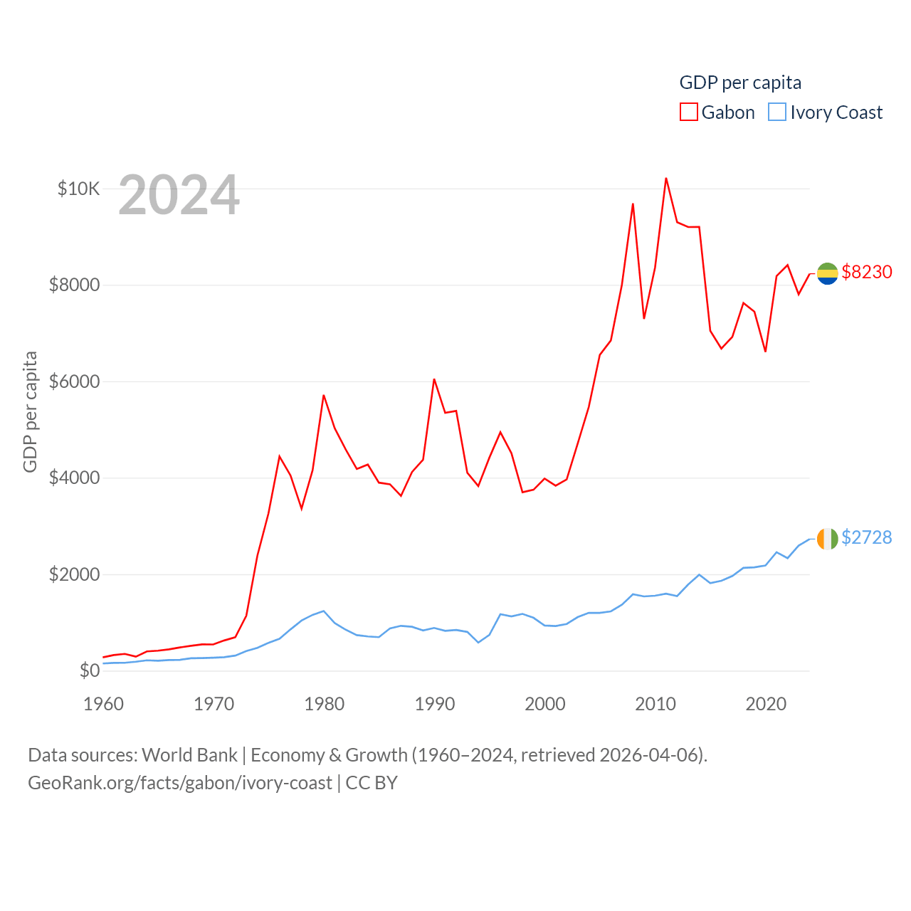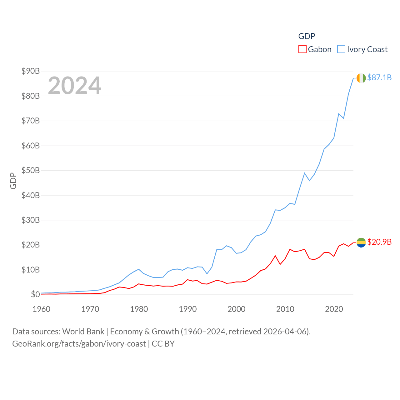 By GDP, Gabon ranks 127/197 ($20.9B) and Ivory Coast ranks 77/197 ($87.1B). By GDP per capita, Gabon ranks 93/197 ($8,230), while Ivory Coast ranks 142/197 ($2,728).