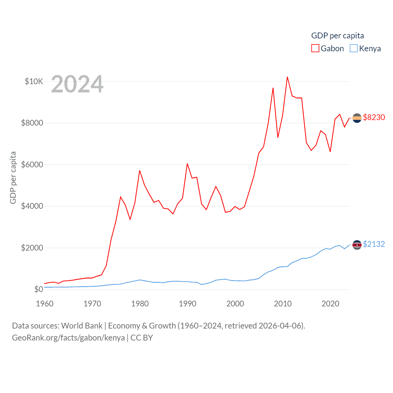 By GDP, Gabon ranks 127/197 ($20.9B) and Kenya ranks 64/197 ($120B). By GDP per capita, Gabon ranks 93/197 ($8,230), while Kenya ranks 154/197 ($2,132).