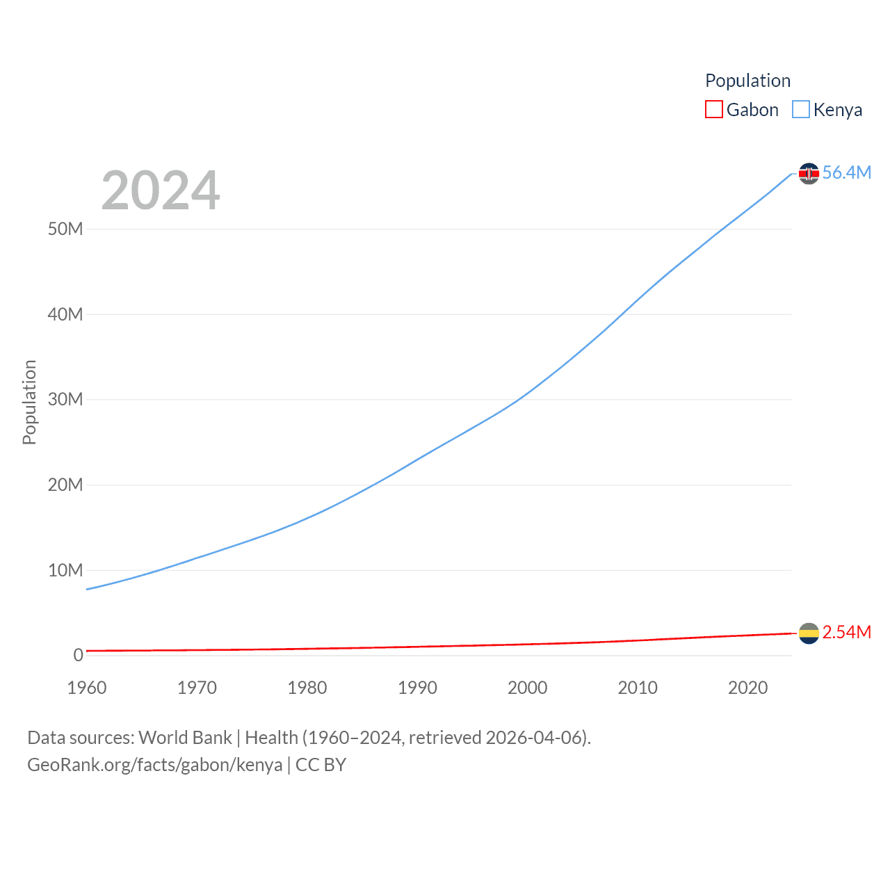 Gabon has a population of 2.54M (ranked 141/197), compared with 56.4M in Kenya (ranked 26/197). Gabon's land area is 99,487 sq mi versus 224,278 sq mi for Kenya (ranked 75th vs. 45th).