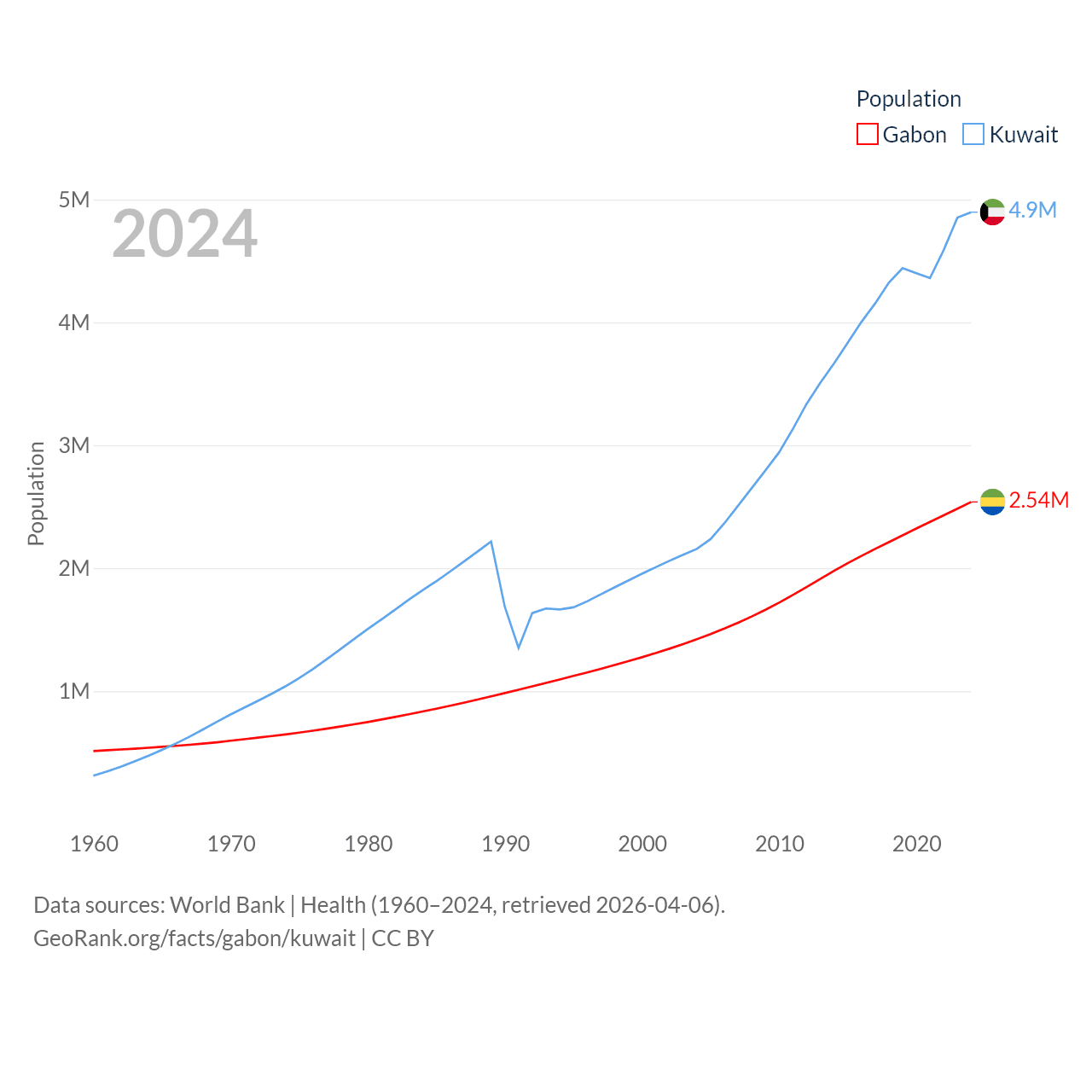 Gabon has a population of 2.54M (ranked 141/197), compared with 4.9M in Kuwait (ranked 127/197). Gabon's land area is 99,487 sq mi versus 6,880 sq mi for Kuwait (ranked 75th vs. 153rd).