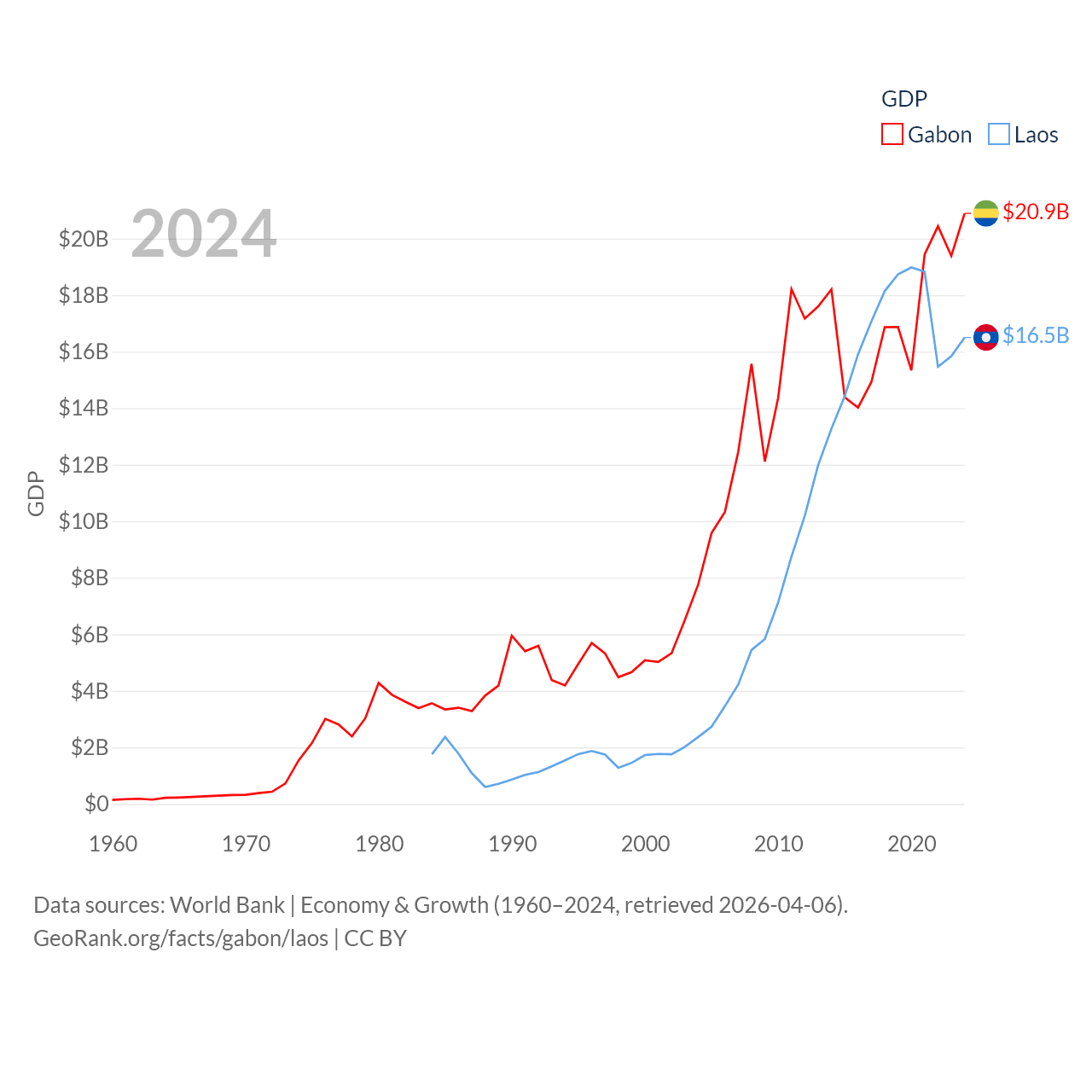 By GDP, Gabon ranks 127/197 ($20.9B) and Laos ranks 139/197 ($16.5B). By GDP per capita, Gabon ranks 93/197 ($8,230), while Laos ranks 155/197 ($2,124).