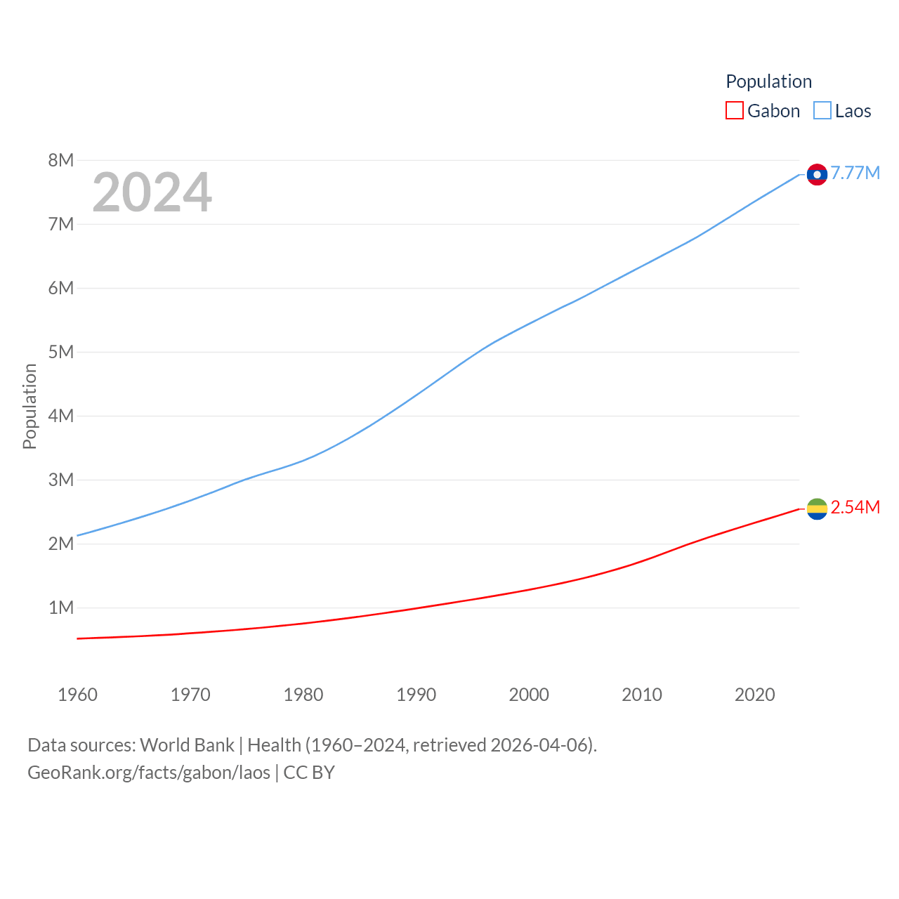 Gabon has a population of 2.54M (ranked 141/197), compared with 7.77M in Laos (ranked 103/197). Gabon's land area is 99,487 sq mi versus 89,112 sq mi for Laos (ranked 75th vs. 79th).