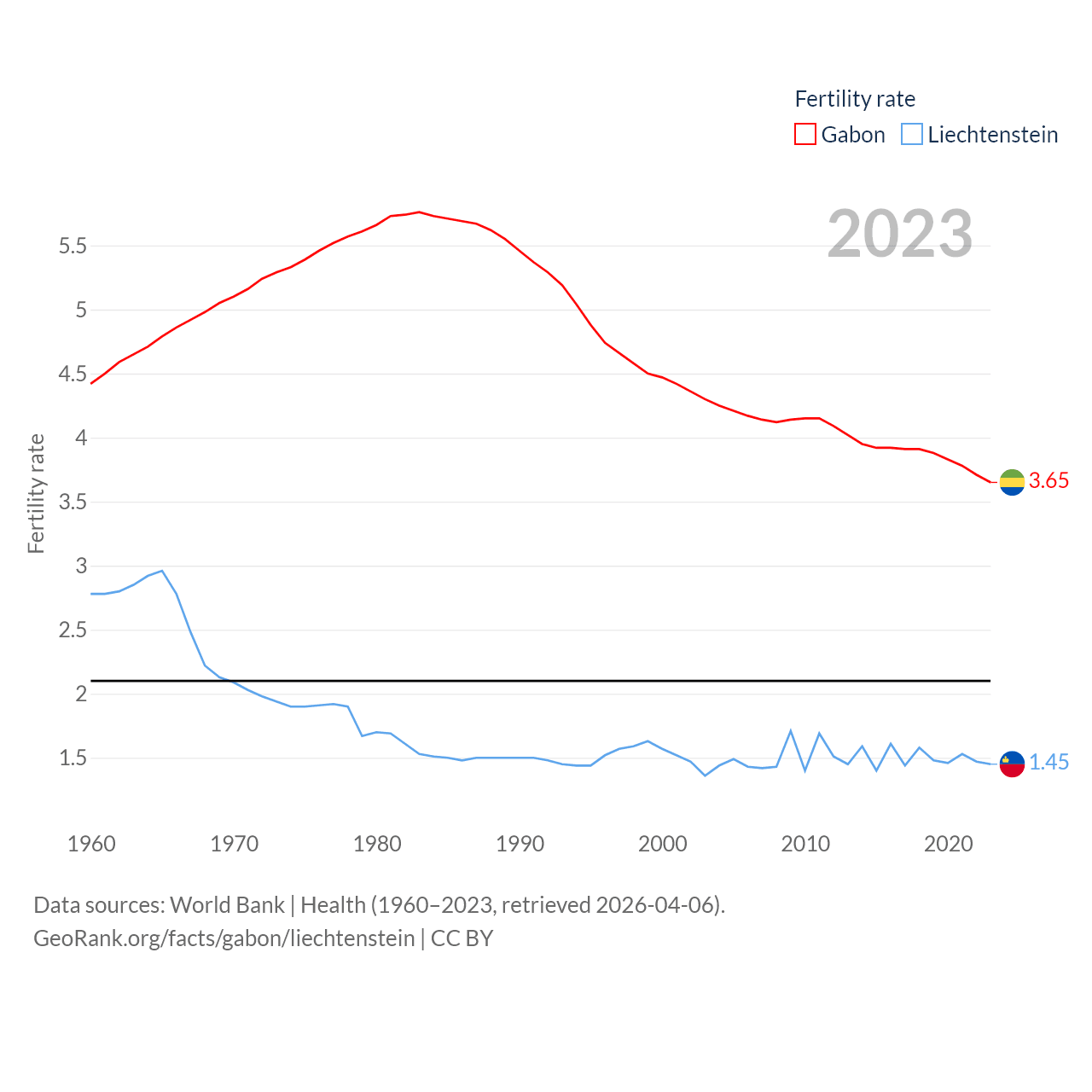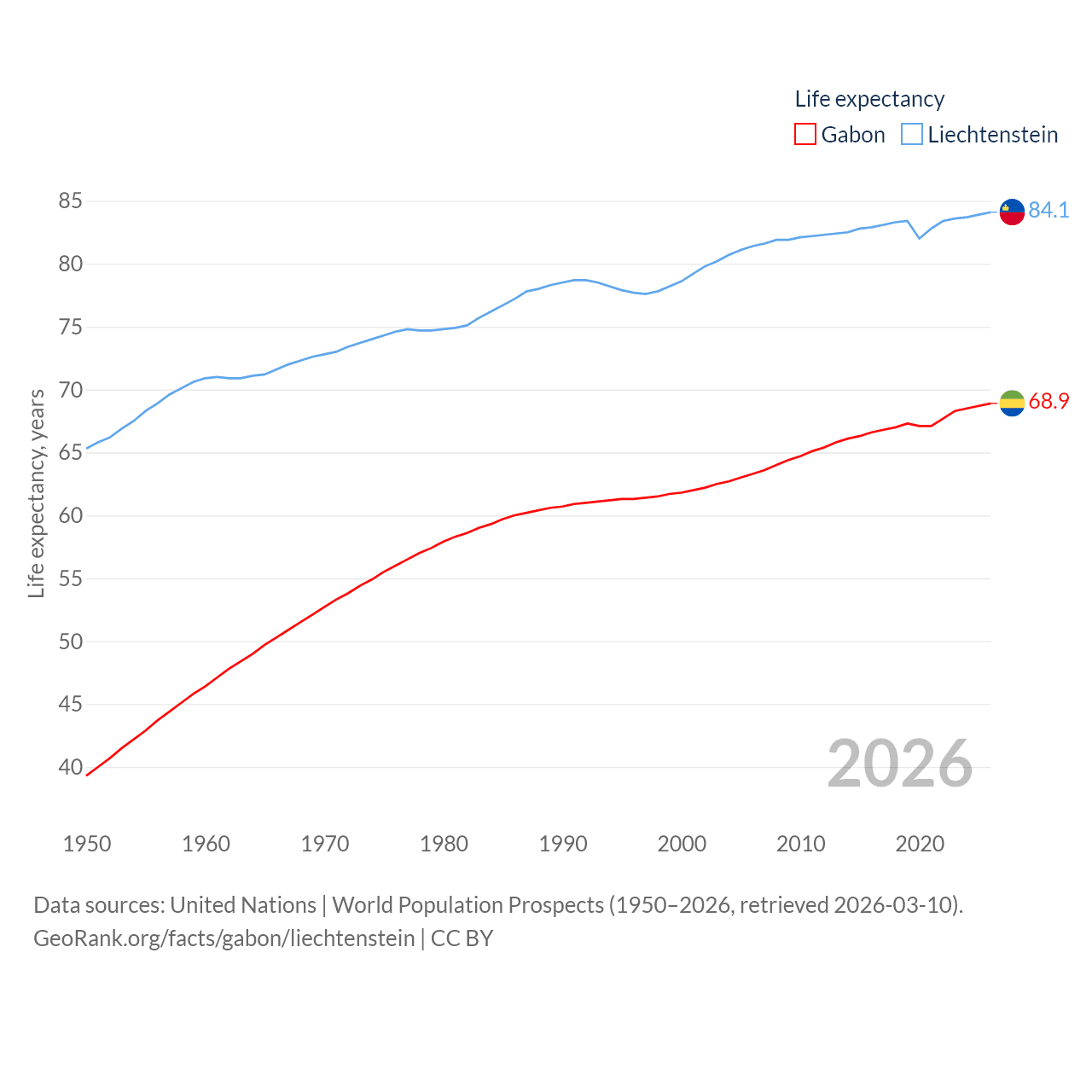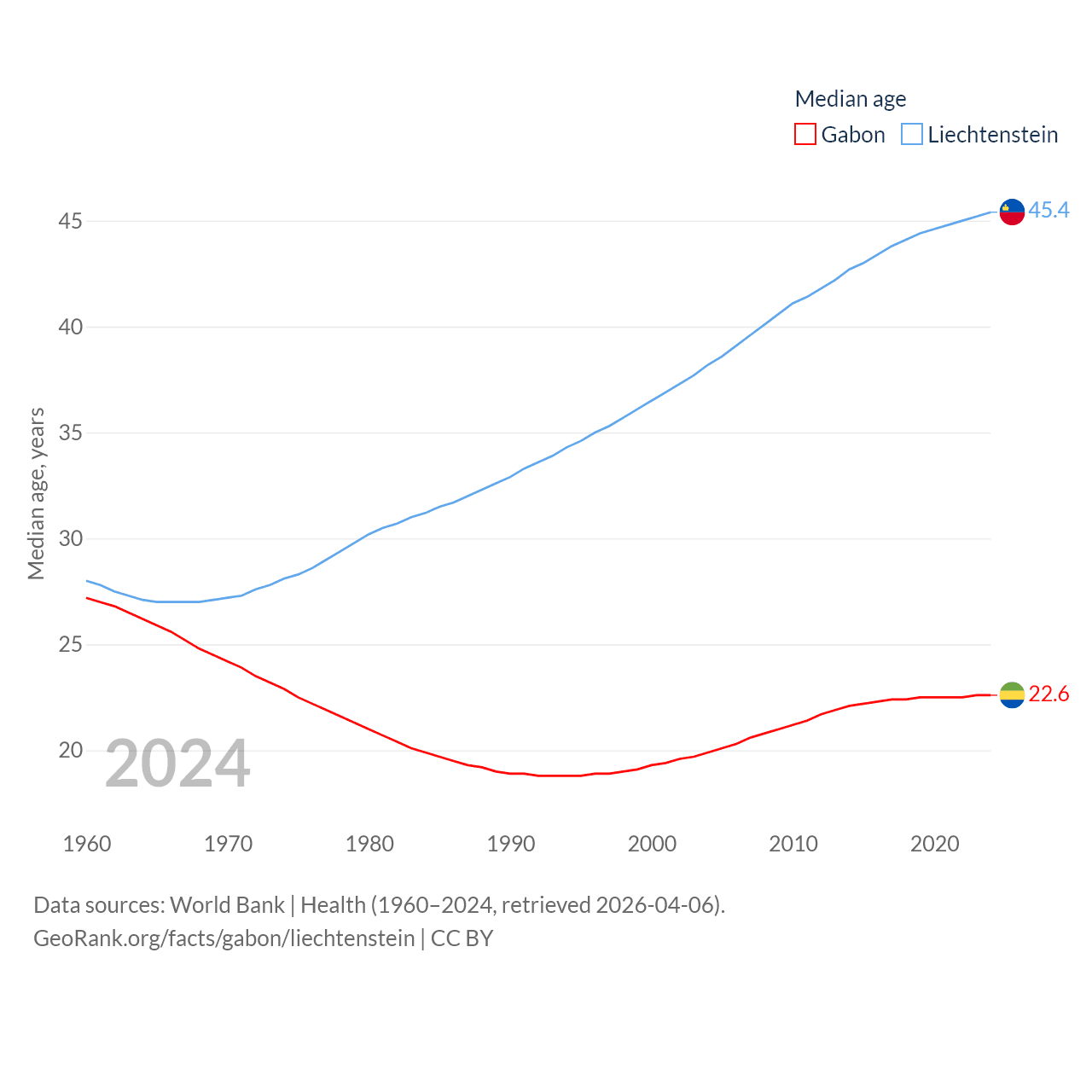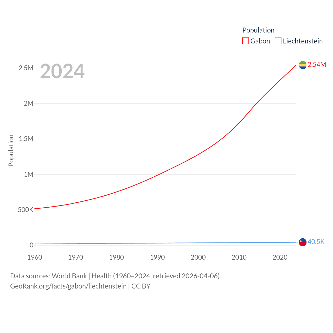 Gabon has a population of 2.54M (ranked 141/197), compared with 40.4K in Liechtenstein (ranked 190/197). Gabon's land area is 99,487 sq mi versus 61.8 sq mi for Liechtenstein (ranked 75th vs. 192nd).