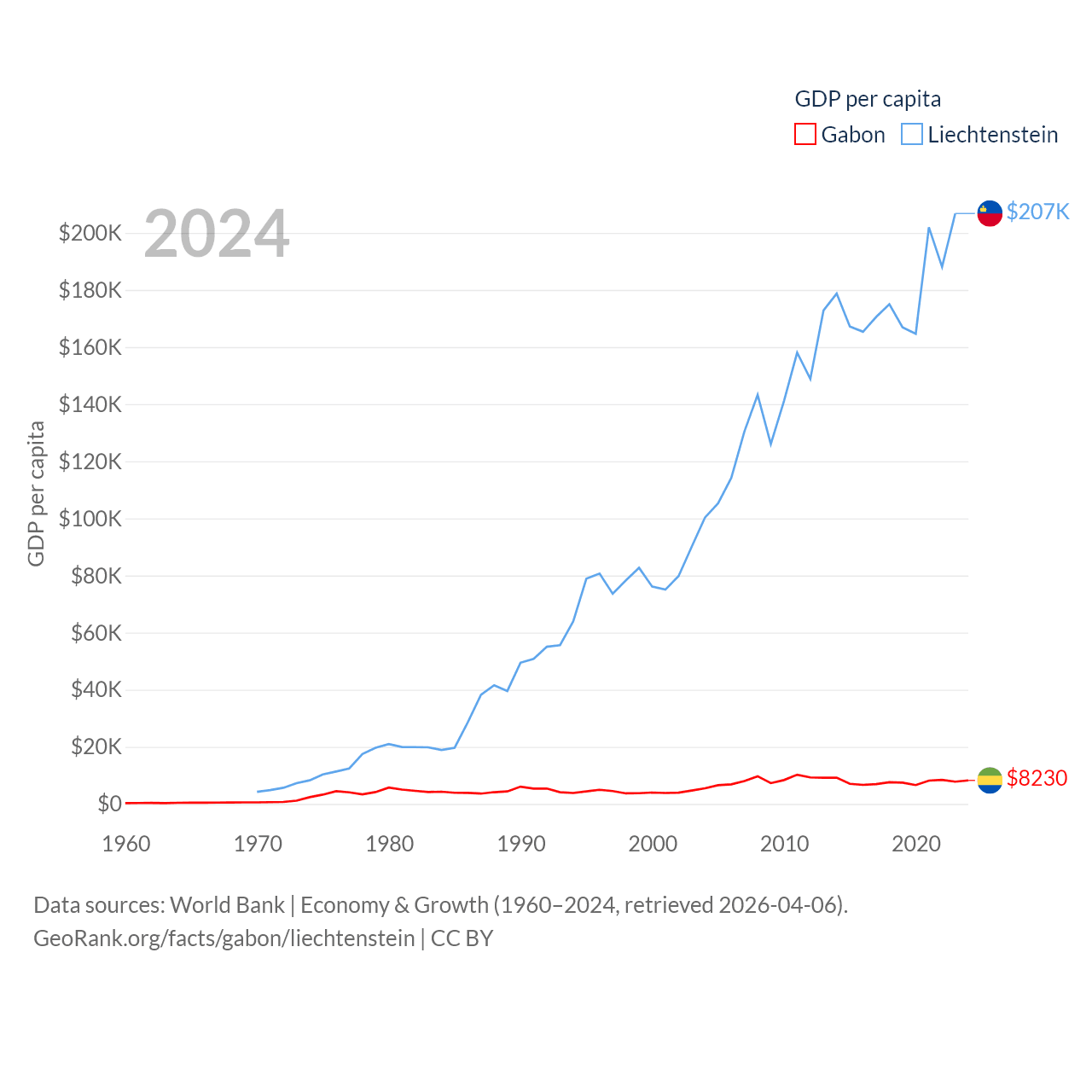 By GDP, Gabon ranks 127/197 ($20.9B) and Liechtenstein ranks 156/197 ($8.24B). By GDP per capita, Gabon ranks 93/197 ($8,230), while Liechtenstein ranks 2/197 ($206,781).