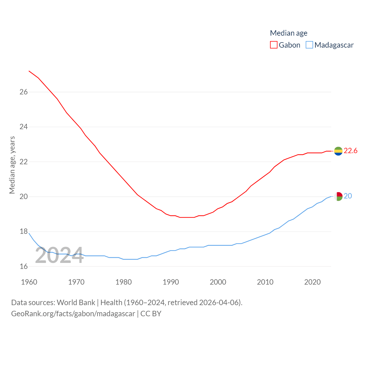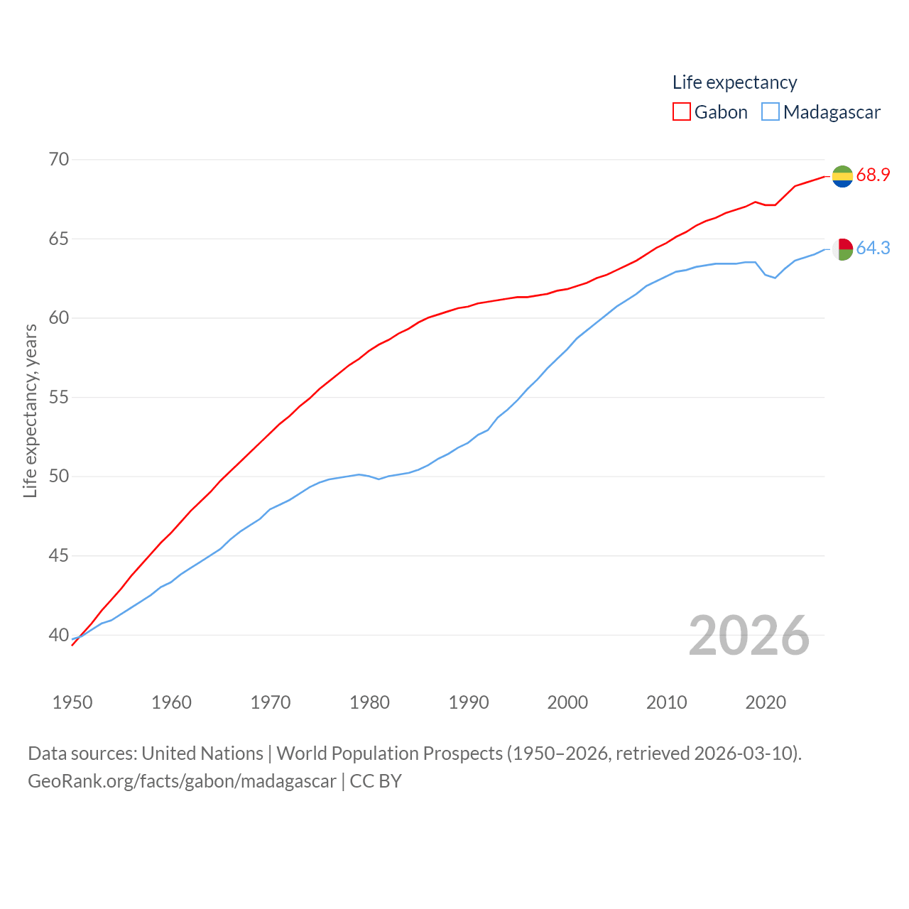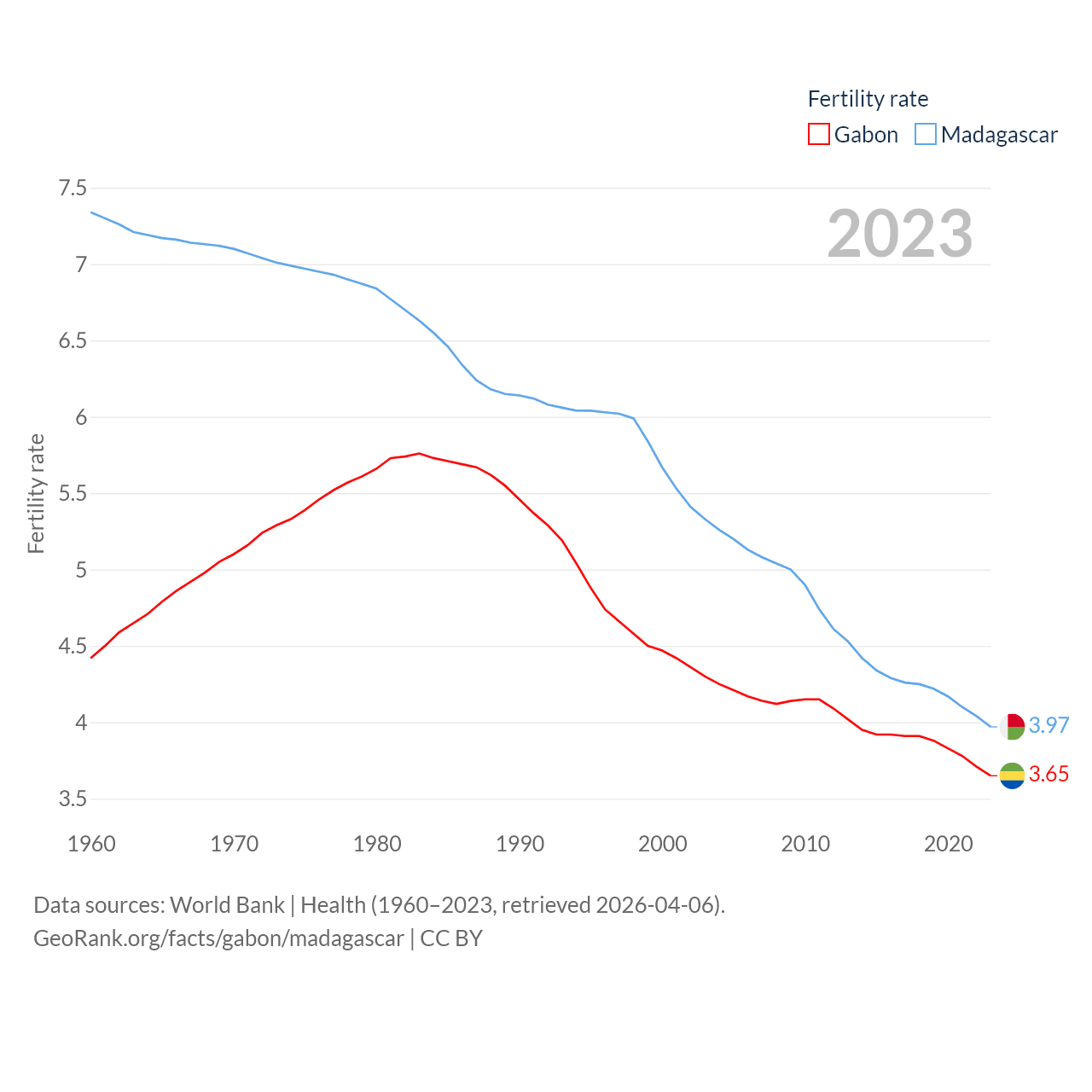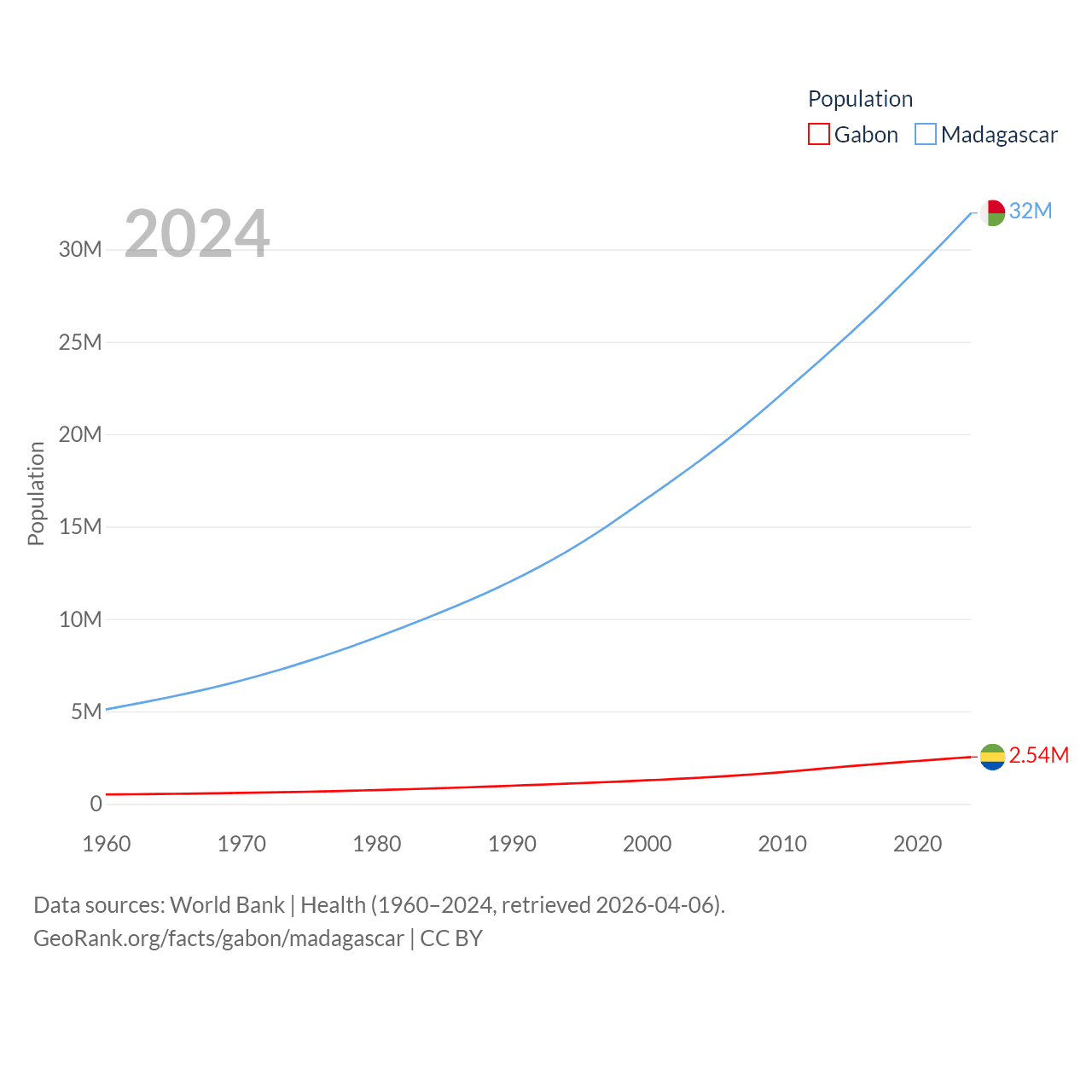 Gabon has a population of 2.54M (ranked 141/197), compared with 32M in Madagascar (ranked 49/197). Gabon's land area is 99,487 sq mi versus 224,634 sq mi for Madagascar (ranked 75th vs. 44th).
