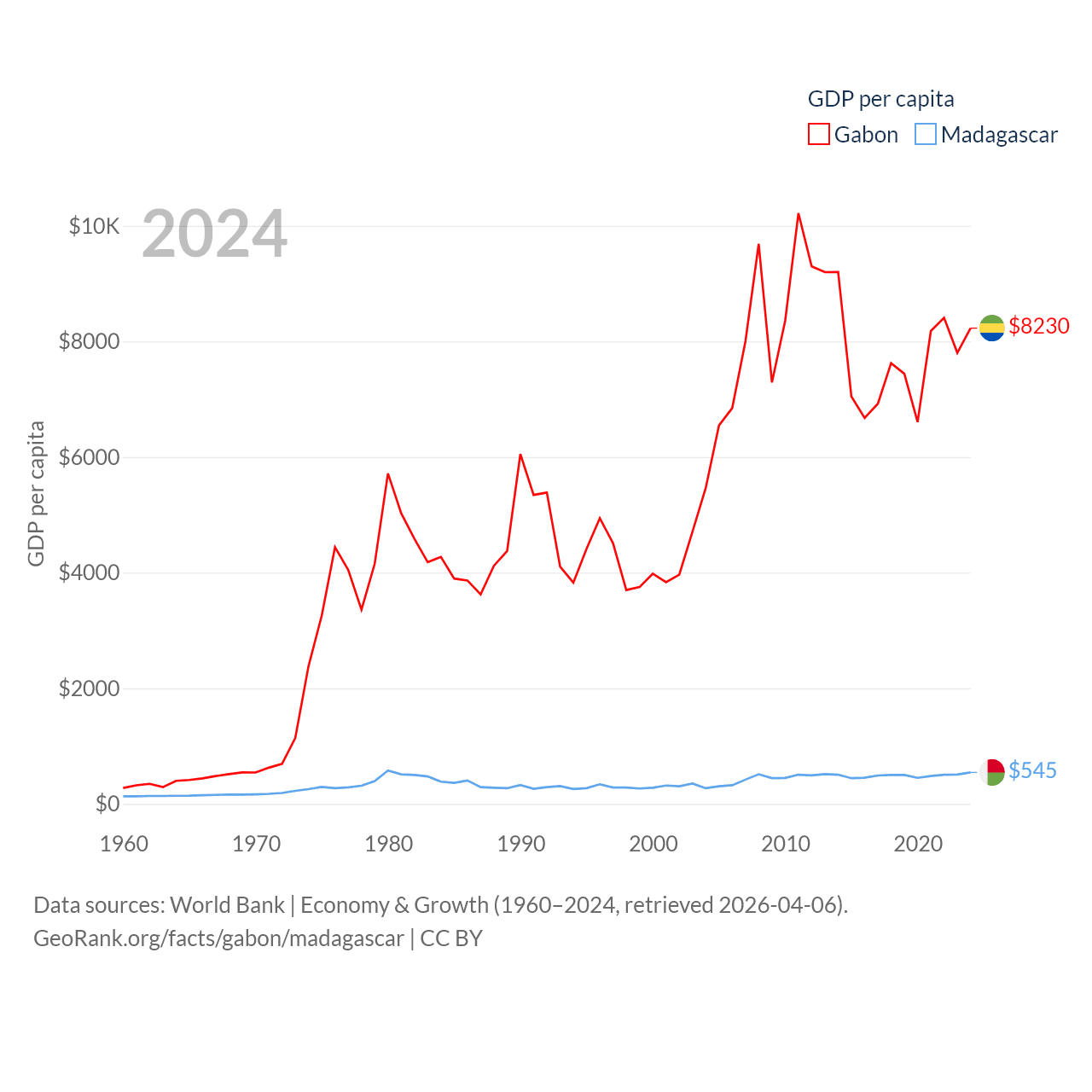 By GDP, Gabon ranks 127/197 ($20.9B) and Madagascar ranks 136/197 ($17.4B). By GDP per capita, Gabon ranks 93/197 ($8,230), while Madagascar ranks 193/197 ($545).