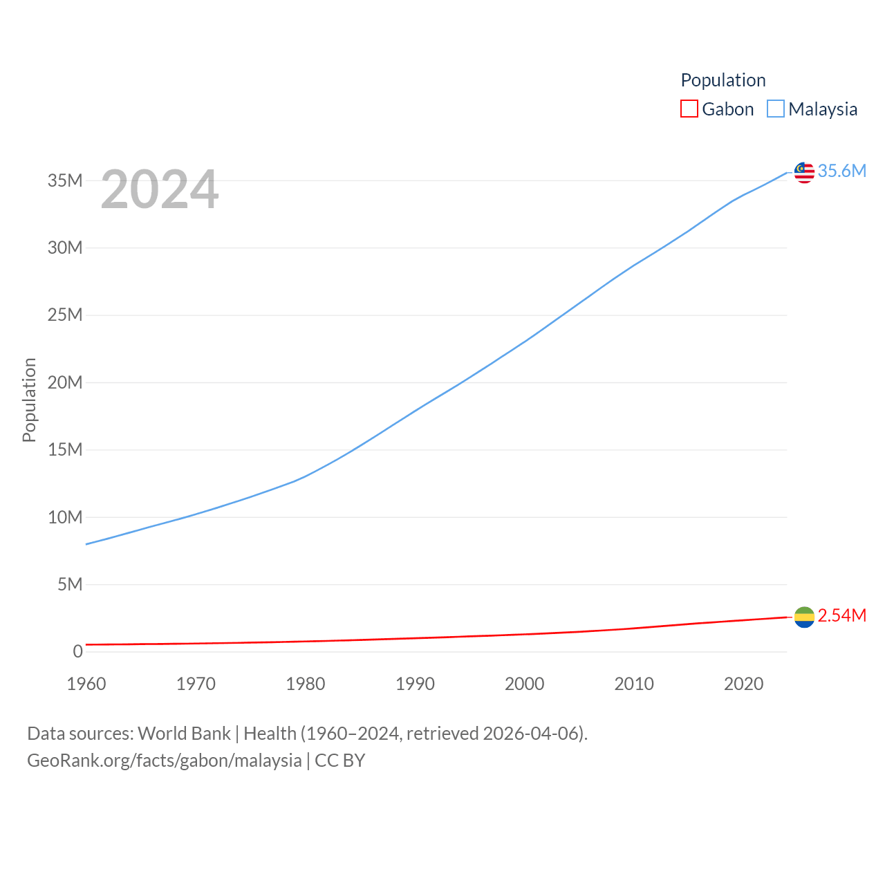 Gabon has a population of 2.54M (ranked 141/197), compared with 35.6M in Malaysia (ranked 44/197). Gabon's land area is 99,487 sq mi versus 126,854 sq mi for Malaysia (ranked 75th vs. 65th).