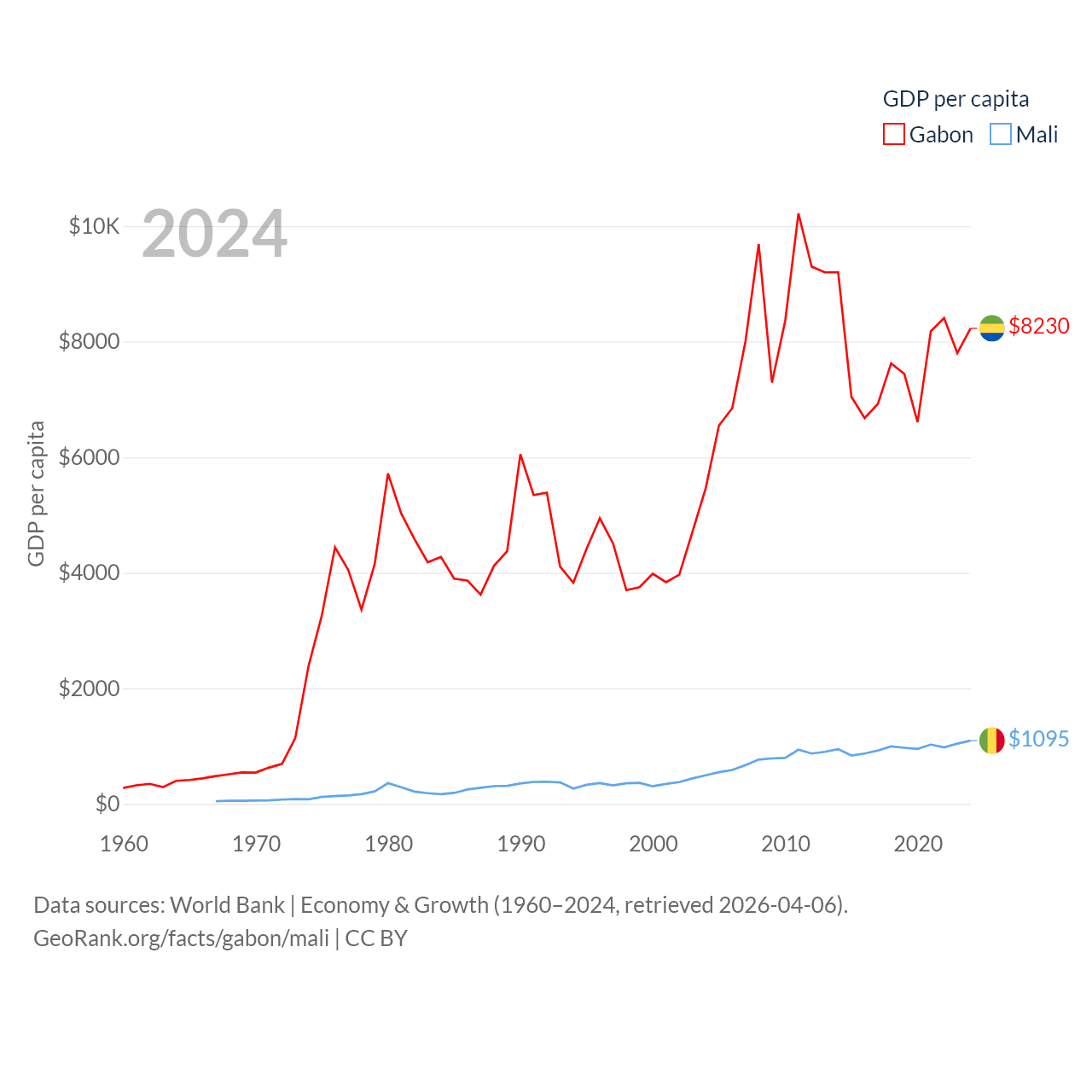 By GDP, Gabon ranks 127/197 ($20.9B) and Mali ranks 113/197 ($26.8B). By GDP per capita, Gabon ranks 93/197 ($8,230), while Mali ranks 173/197 ($1,095).