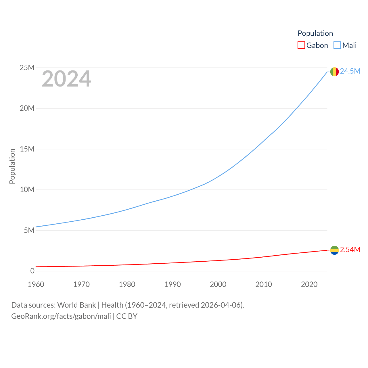 Gabon has a population of 2.54M (ranked 141/197), compared with 24.5M in Mali (ranked 58/197). Gabon's land area is 99,487 sq mi versus 471,118 sq mi for Mali (ranked 75th vs. 23rd).