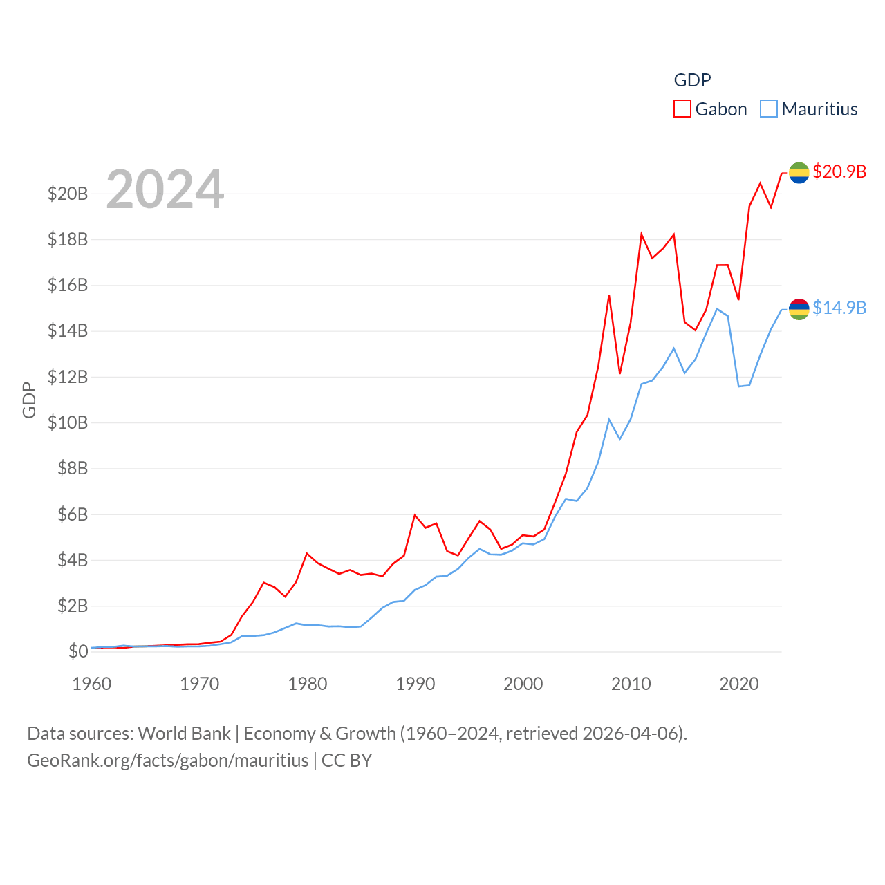 By GDP, Gabon ranks 127/197 ($20.9B) and Mauritius ranks 143/197 ($14.9B). By GDP per capita, Gabon ranks 93/197 ($8,230), while Mauritius ranks 78/197 ($11,991).