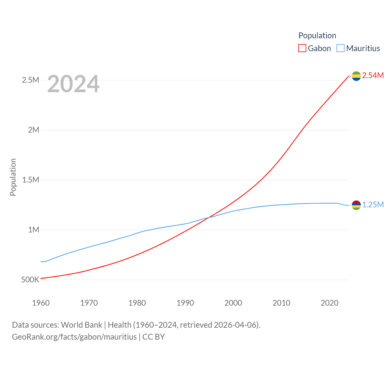 Gabon has a population of 2.54M (ranked 141/197), compared with 1.25M in Mauritius (ranked 156/197). Gabon's land area is 99,487 sq mi versus 771 sq mi for Mauritius (ranked 75th vs. 170th).