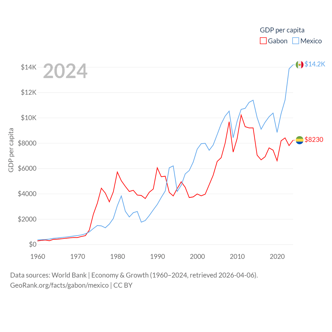 By GDP, Gabon ranks 127/197 ($20.9B) and Mexico ranks 13/197 ($1.86T). By GDP per capita, Gabon ranks 93/197 ($8,230), while Mexico ranks 69/197 ($14,186).