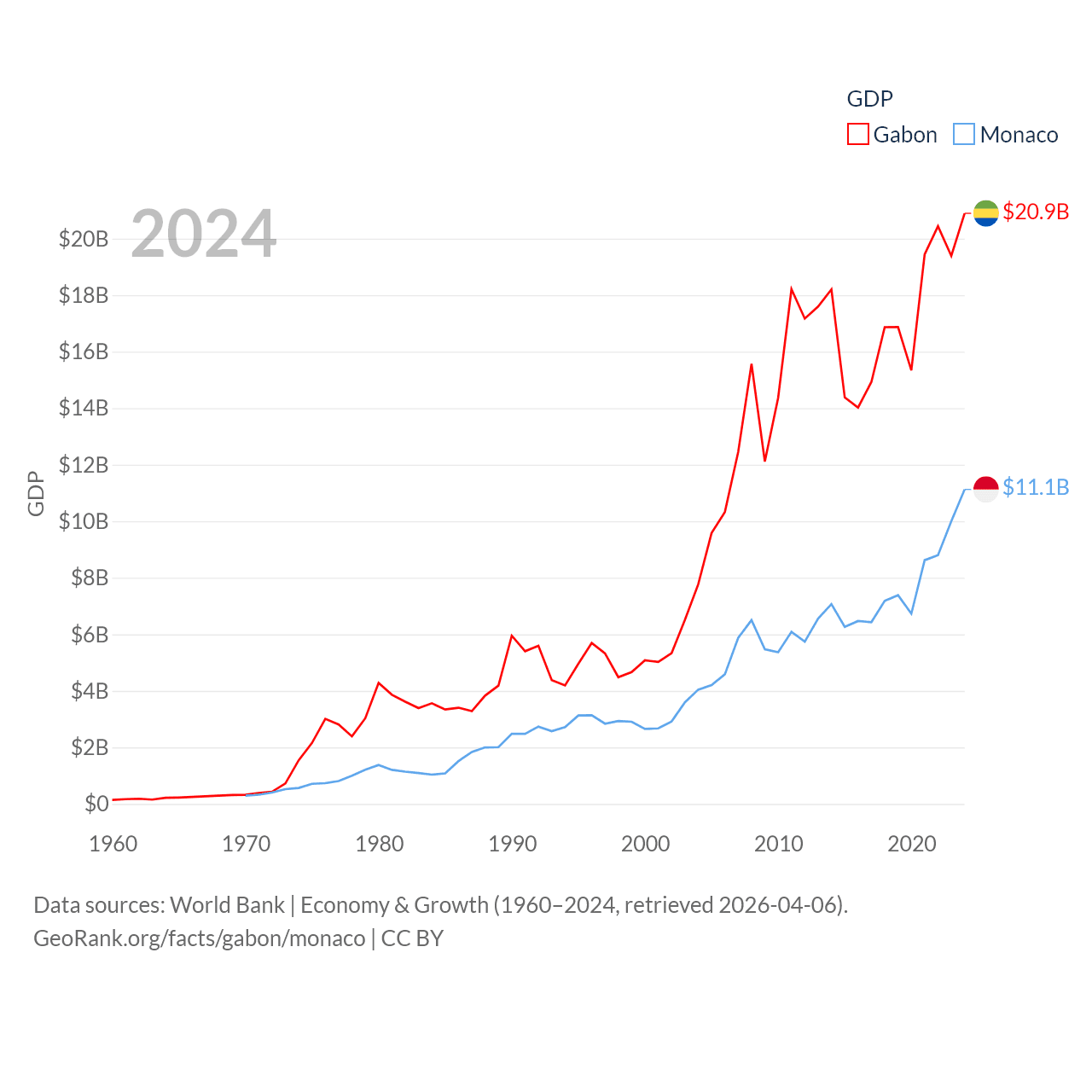 By GDP, Gabon ranks 127/197 ($20.9B) and Monaco ranks 152/197 ($11.1B). By GDP per capita, Gabon ranks 93/197 ($8,230), while Monaco ranks 1/197 ($288,001).