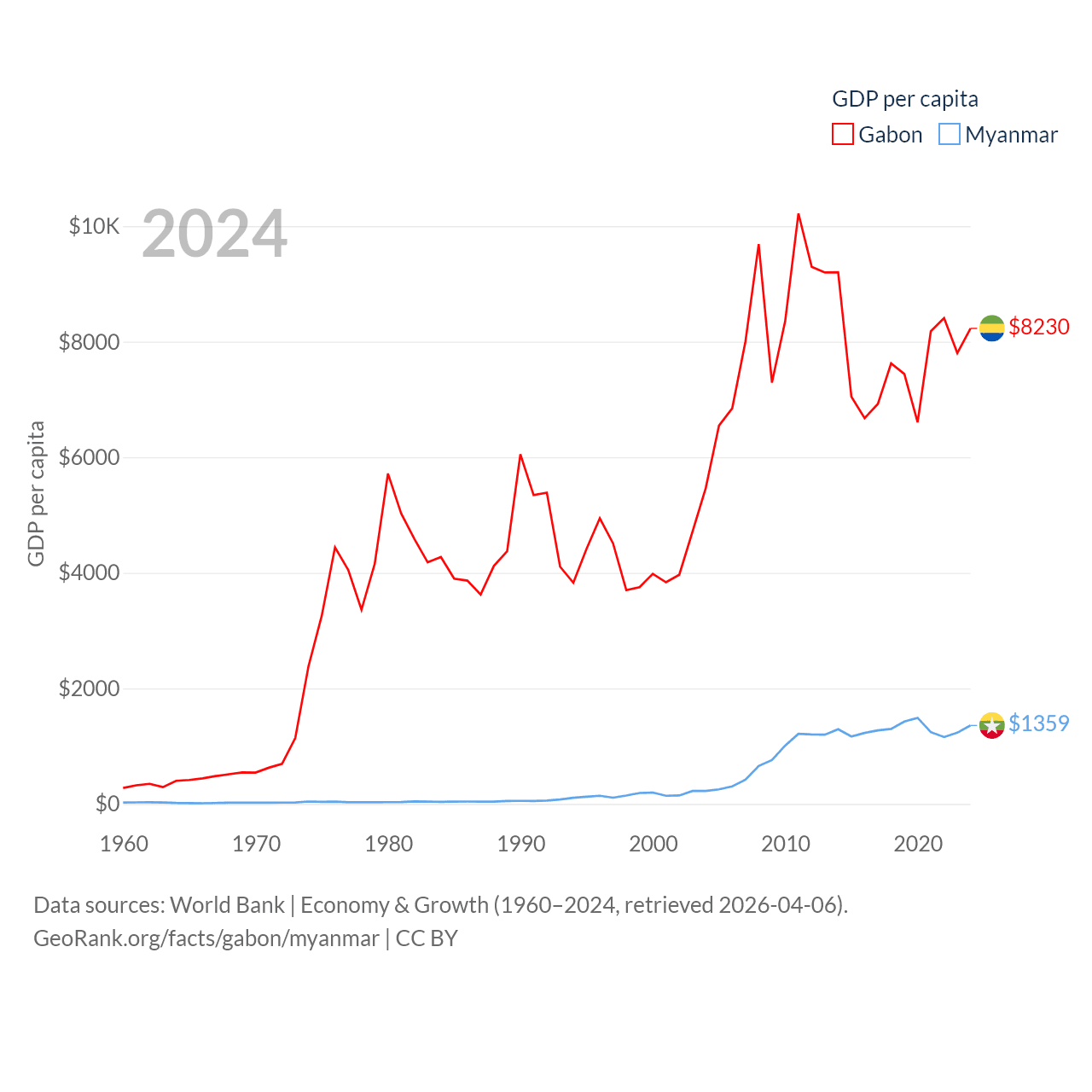 By GDP, Gabon ranks 127/197 ($20.9B) and Myanmar ranks 85/197 ($74.1B). By GDP per capita, Gabon ranks 93/197 ($8,230), while Myanmar ranks 165/197 ($1,359).