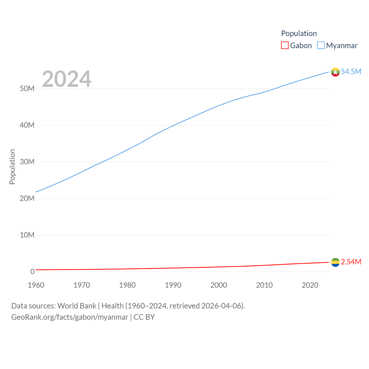 Gabon has a population of 2.54M (ranked 141/197), compared with 54.5M in Myanmar (ranked 27/197). Gabon's land area is 99,487 sq mi versus 251,997 sq mi for Myanmar (ranked 75th vs. 39th).