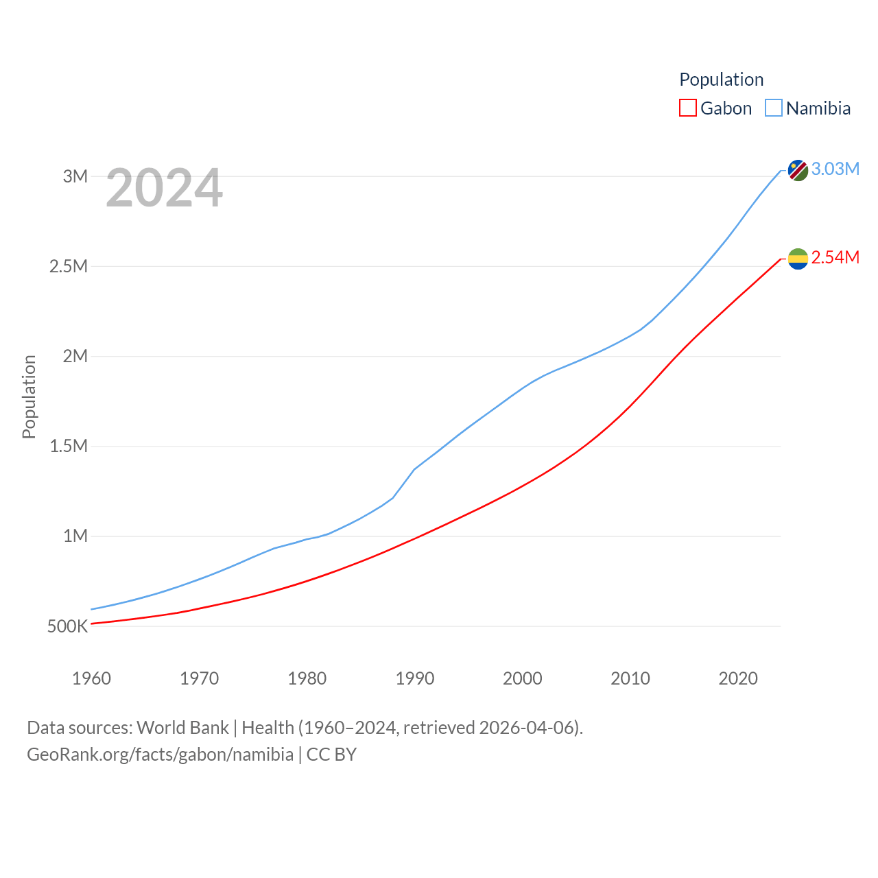 Gabon has a population of 2.54M (ranked 141/197), compared with 3.03M in Namibia (ranked 136/197). Gabon's land area is 99,487 sq mi versus 317,874 sq mi for Namibia (ranked 75th vs. 33rd).