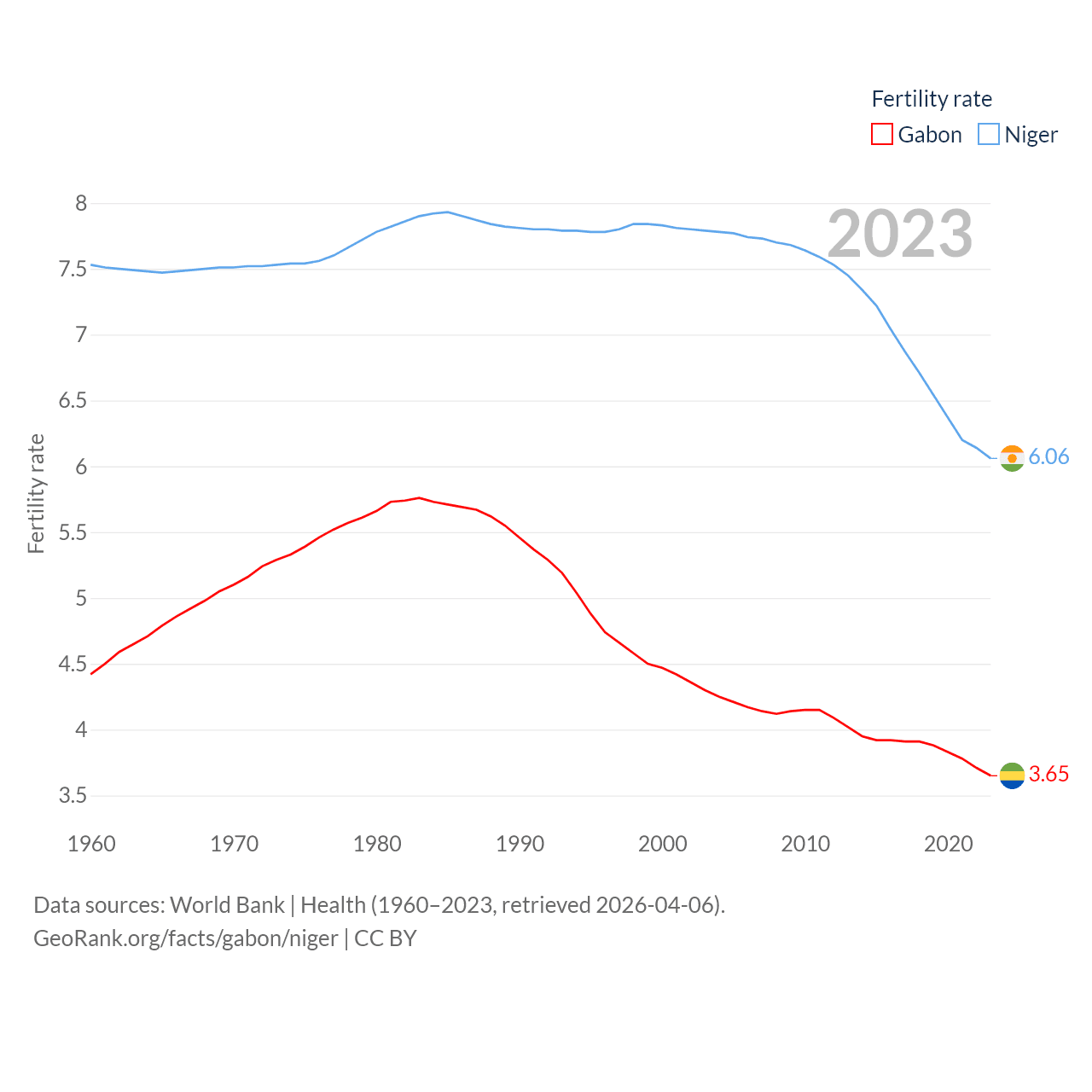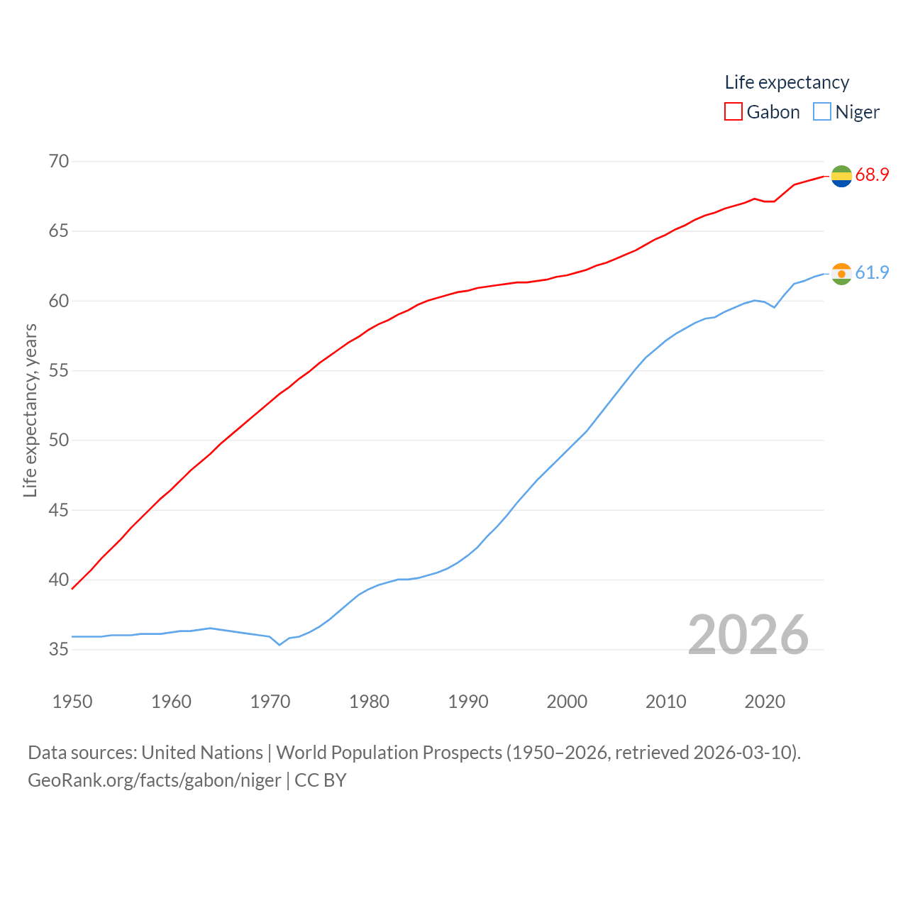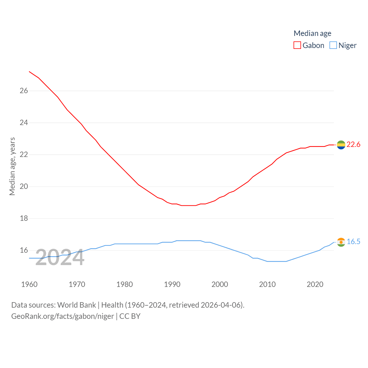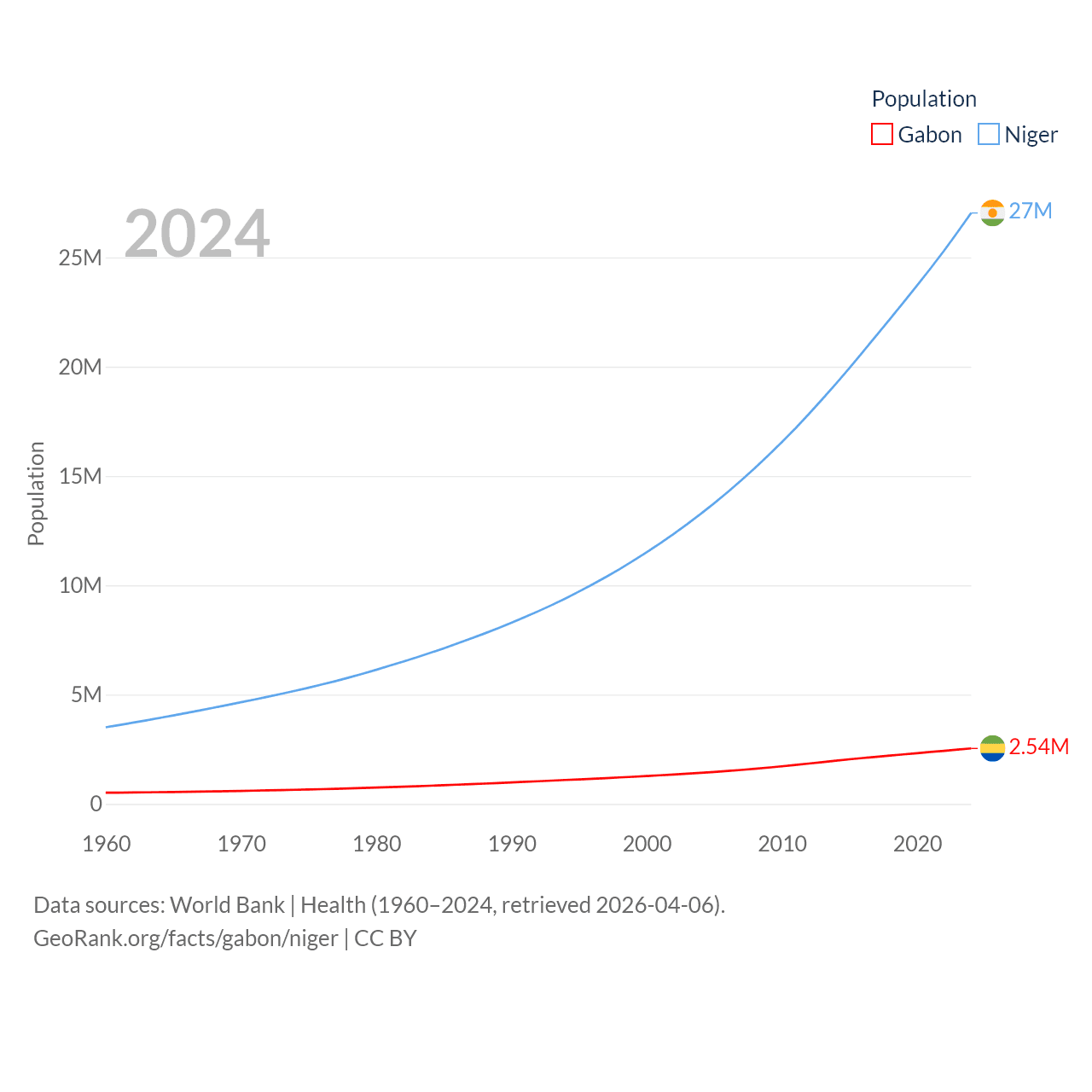 Gabon has a population of 2.54M (ranked 141/197), compared with 27M in Niger (ranked 55/197). Gabon's land area is 99,487 sq mi versus 489,076 sq mi for Niger (ranked 75th vs. 20th).