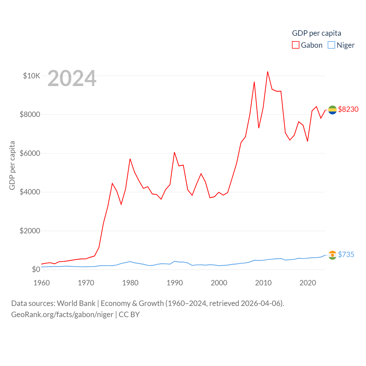 By GDP, Gabon ranks 127/197 ($20.9B) and Niger ranks 130/197 ($19.9B). By GDP per capita, Gabon ranks 93/197 ($8,230), while Niger ranks 187/197 ($735).