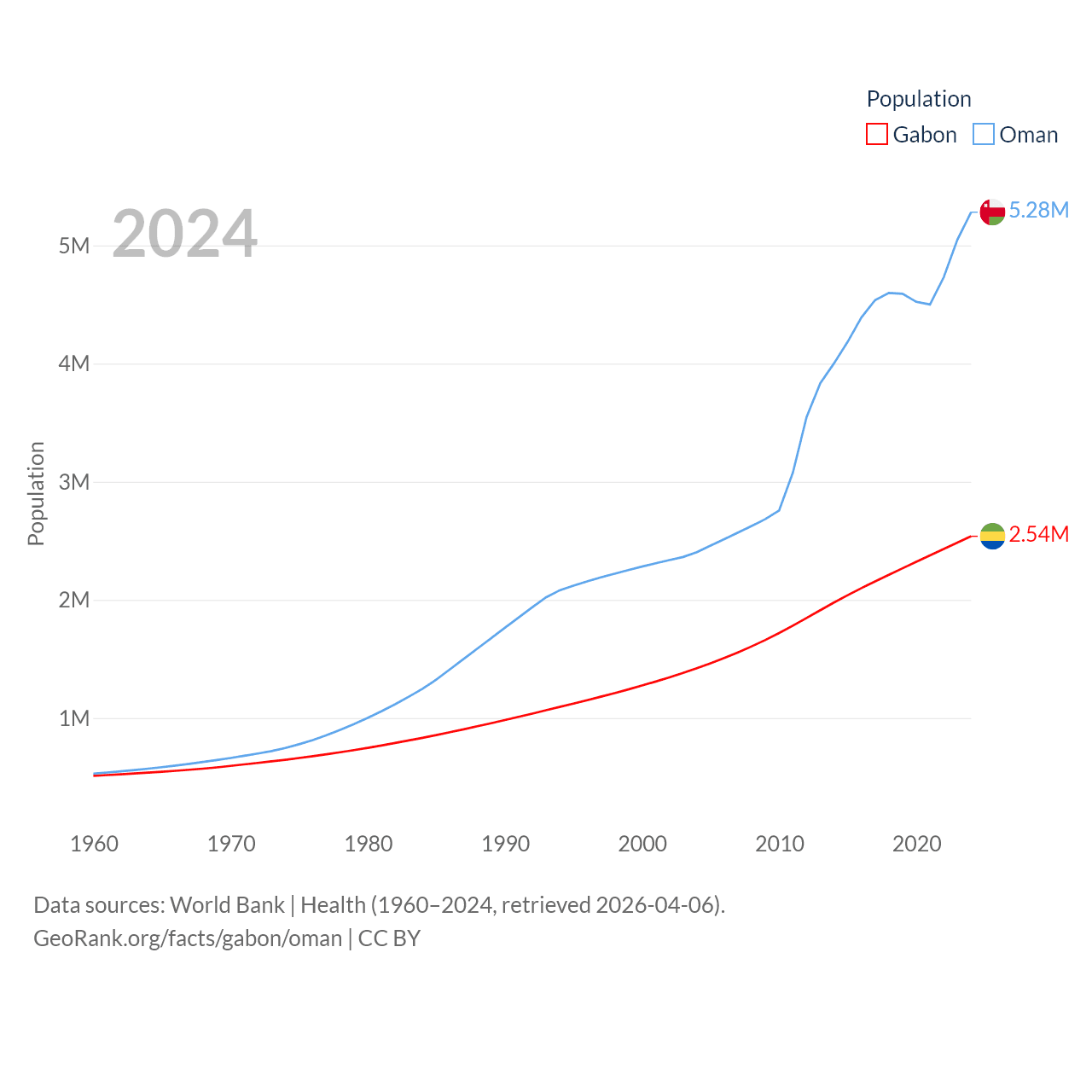 Gabon has a population of 2.54M (ranked 141/197), compared with 5.28M in Oman (ranked 124/197). Gabon's land area is 99,487 sq mi versus 119,499 sq mi for Oman (ranked 75th vs. 68th).