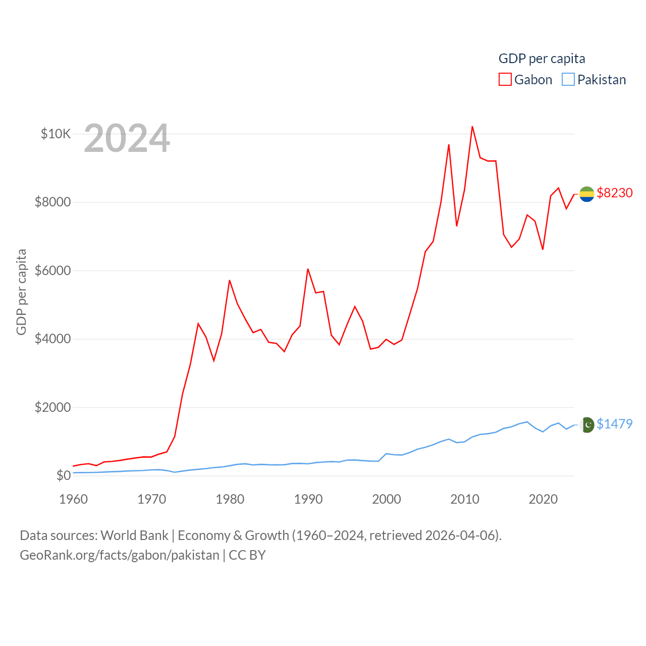 By GDP, Gabon ranks 127/197 ($20.9B) and Pakistan ranks 43/197 ($372B). By GDP per capita, Gabon ranks 93/197 ($8,230), while Pakistan ranks 163/197 ($1,479).