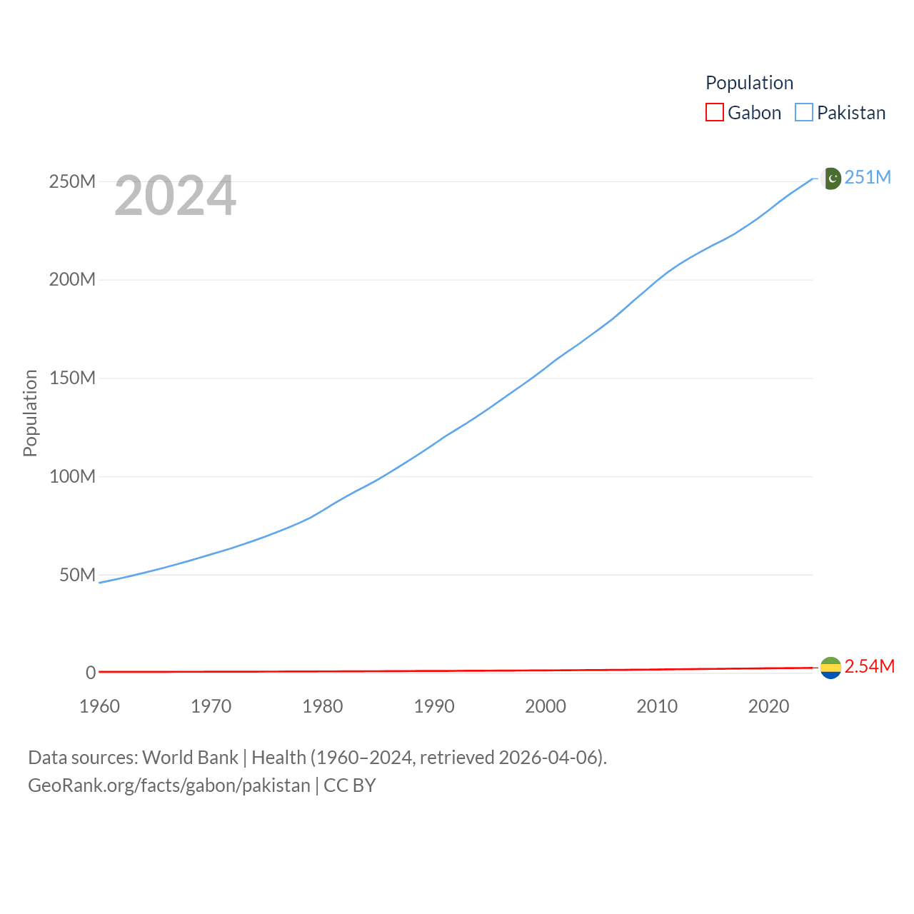 Gabon has a population of 2.54M (ranked 141/197), compared with 251M in Pakistan (ranked 5/197). Gabon's land area is 99,487 sq mi versus 297,638 sq mi for Pakistan (ranked 75th vs. 35th).