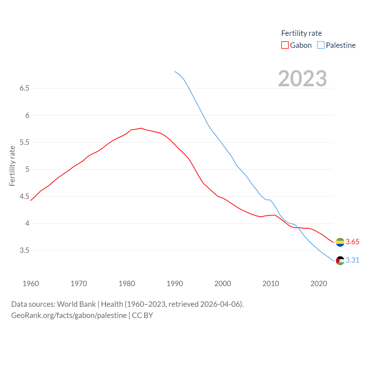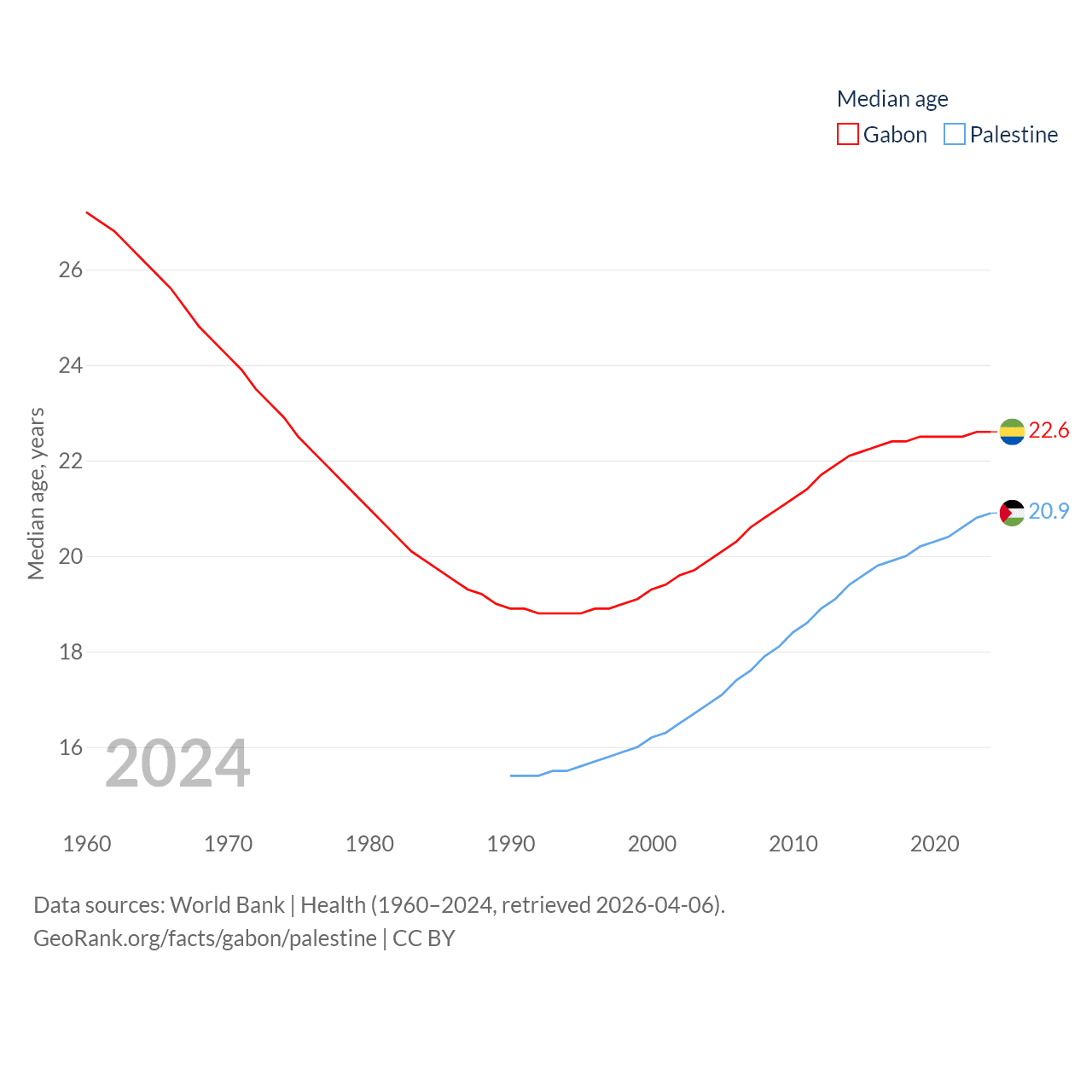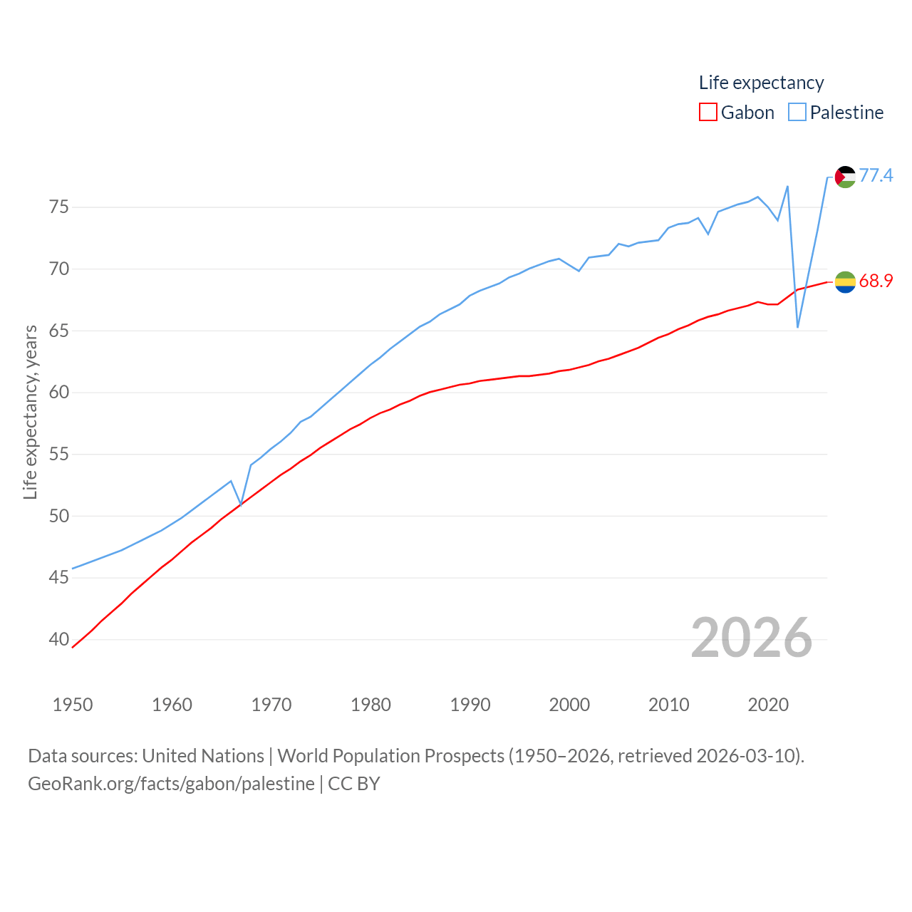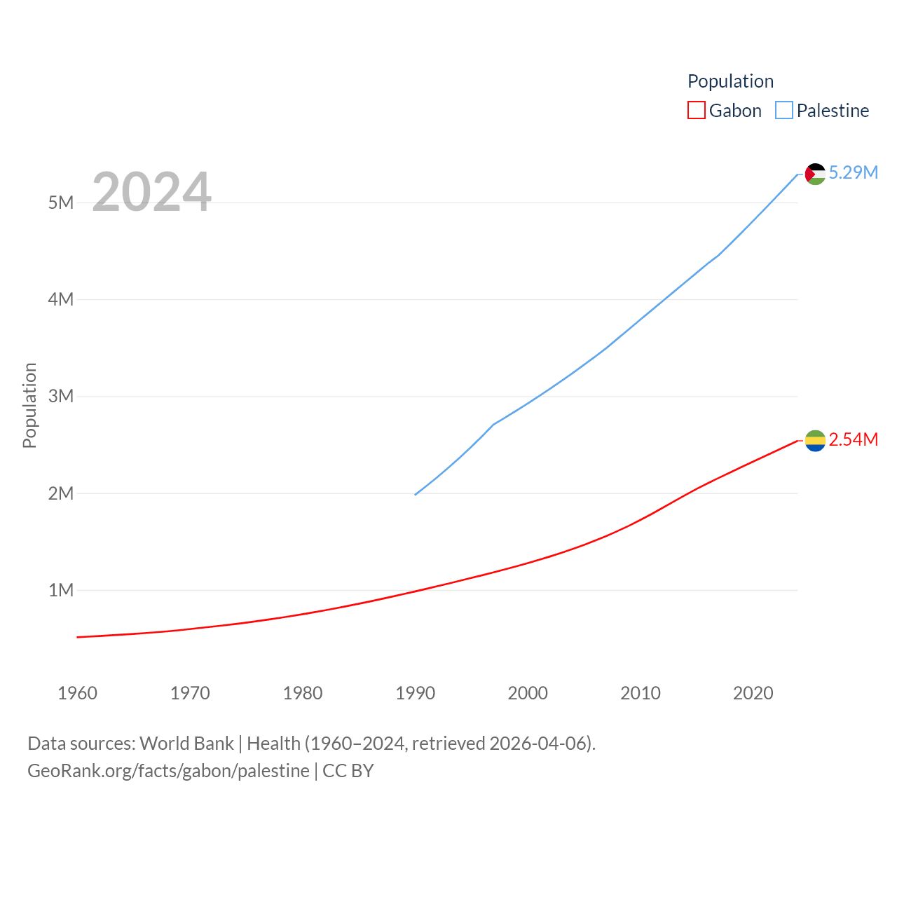 Gabon has a population of 2.54M (ranked 141/197), compared with 5.29M in Palestine (ranked 122/197). Gabon's land area is 99,487 sq mi versus 2,326 sq mi for Palestine (ranked 75th vs. 164th).