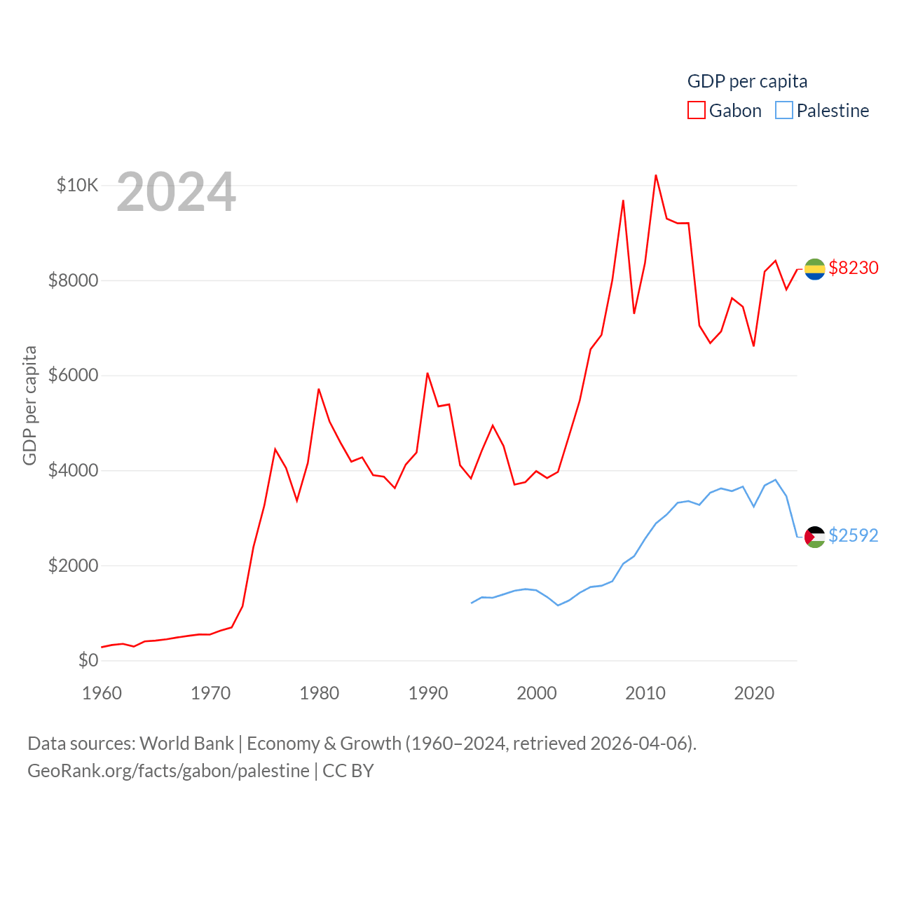 By GDP, Gabon ranks 127/197 ($20.9B) and Palestine ranks 146/197 ($13.7B). By GDP per capita, Gabon ranks 93/197 ($8,230), while Palestine ranks 147/197 ($2,592).