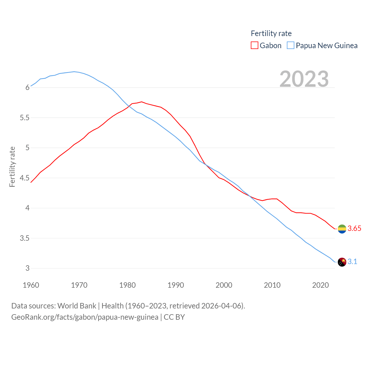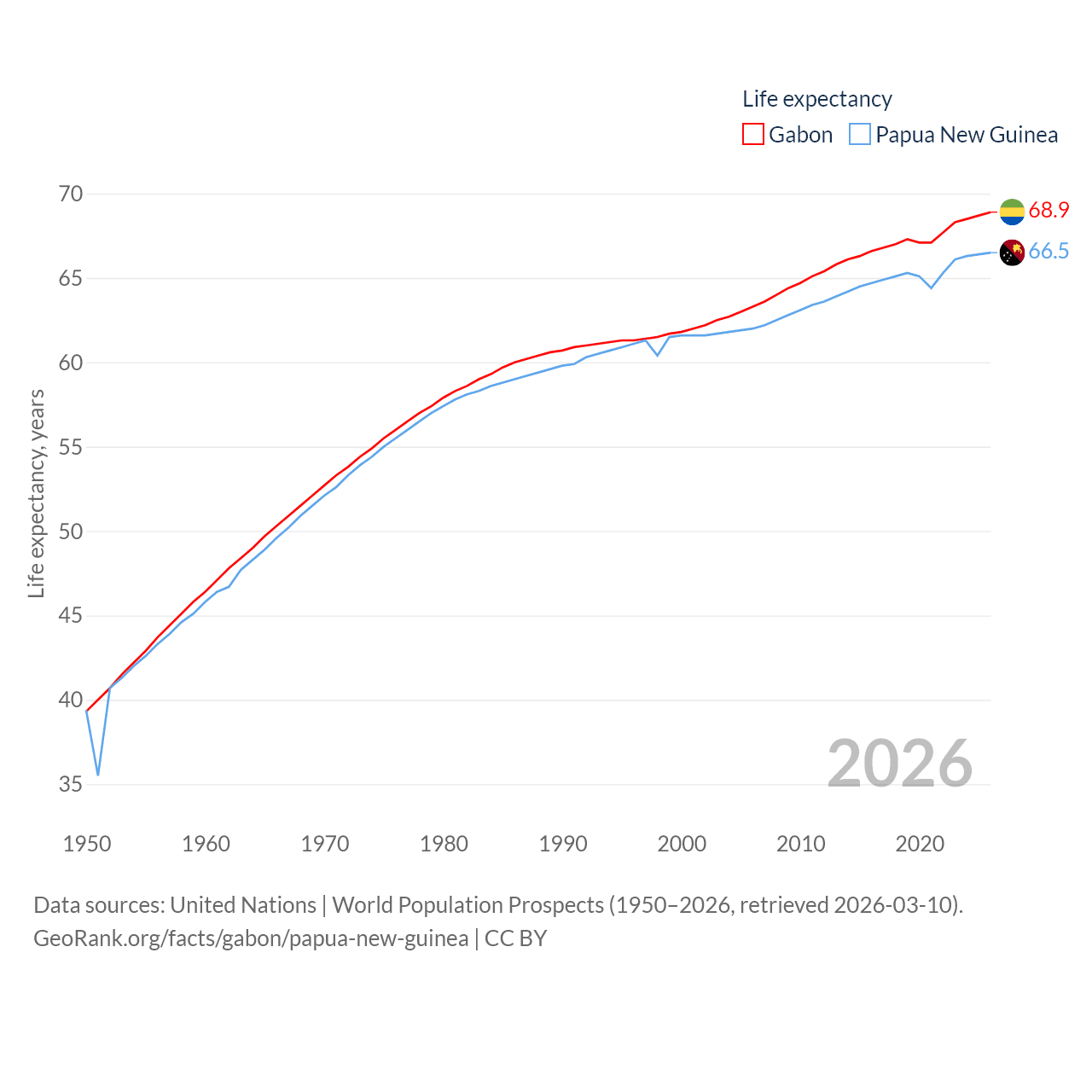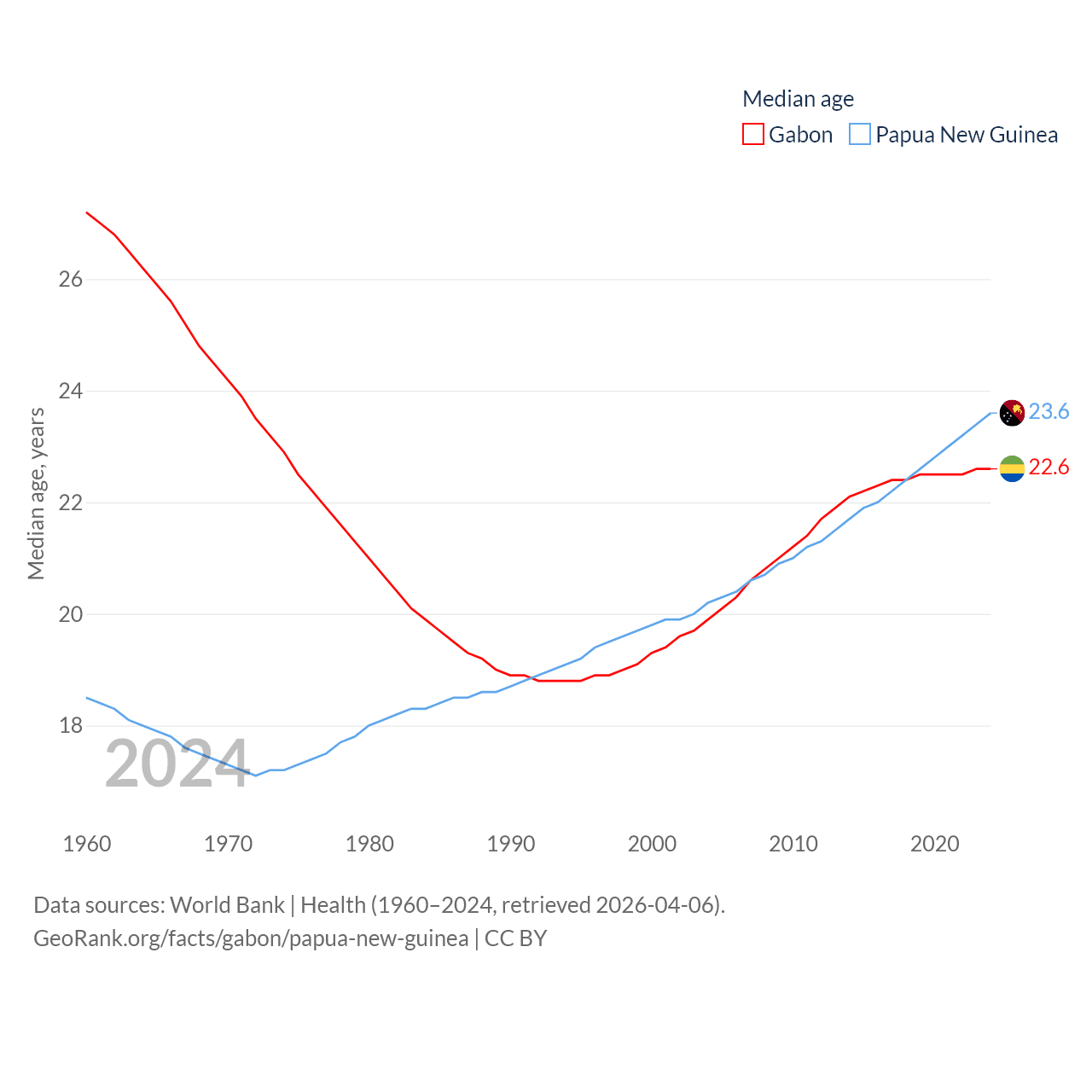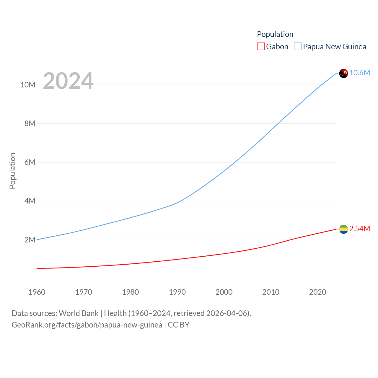 Gabon has a population of 2.54M (ranked 141/197), compared with 10.6M in Papua New Guinea (ranked 92/197). Gabon's land area is 99,487 sq mi versus 174,850 sq mi for Papua New Guinea (ranked 75th vs. 54th).