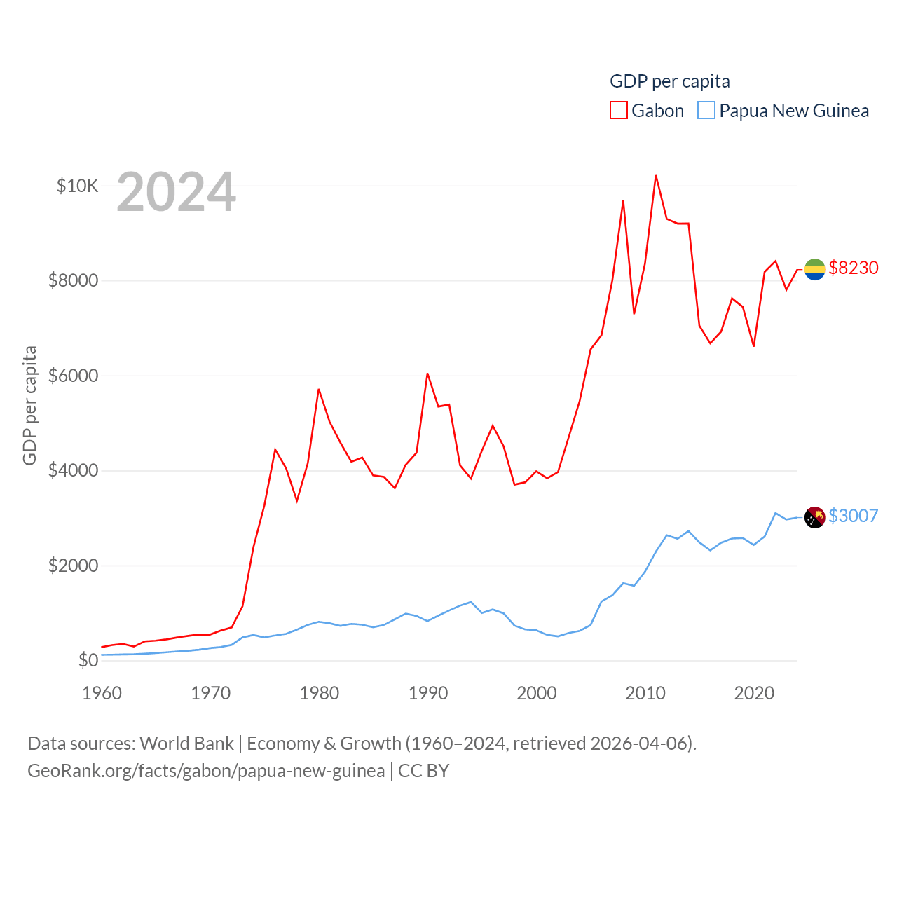 By GDP, Gabon ranks 127/197 ($20.9B) and Papua New Guinea ranks 110/197 ($31.8B). By GDP per capita, Gabon ranks 93/197 ($8,230), while Papua New Guinea ranks 140/197 ($3,007).