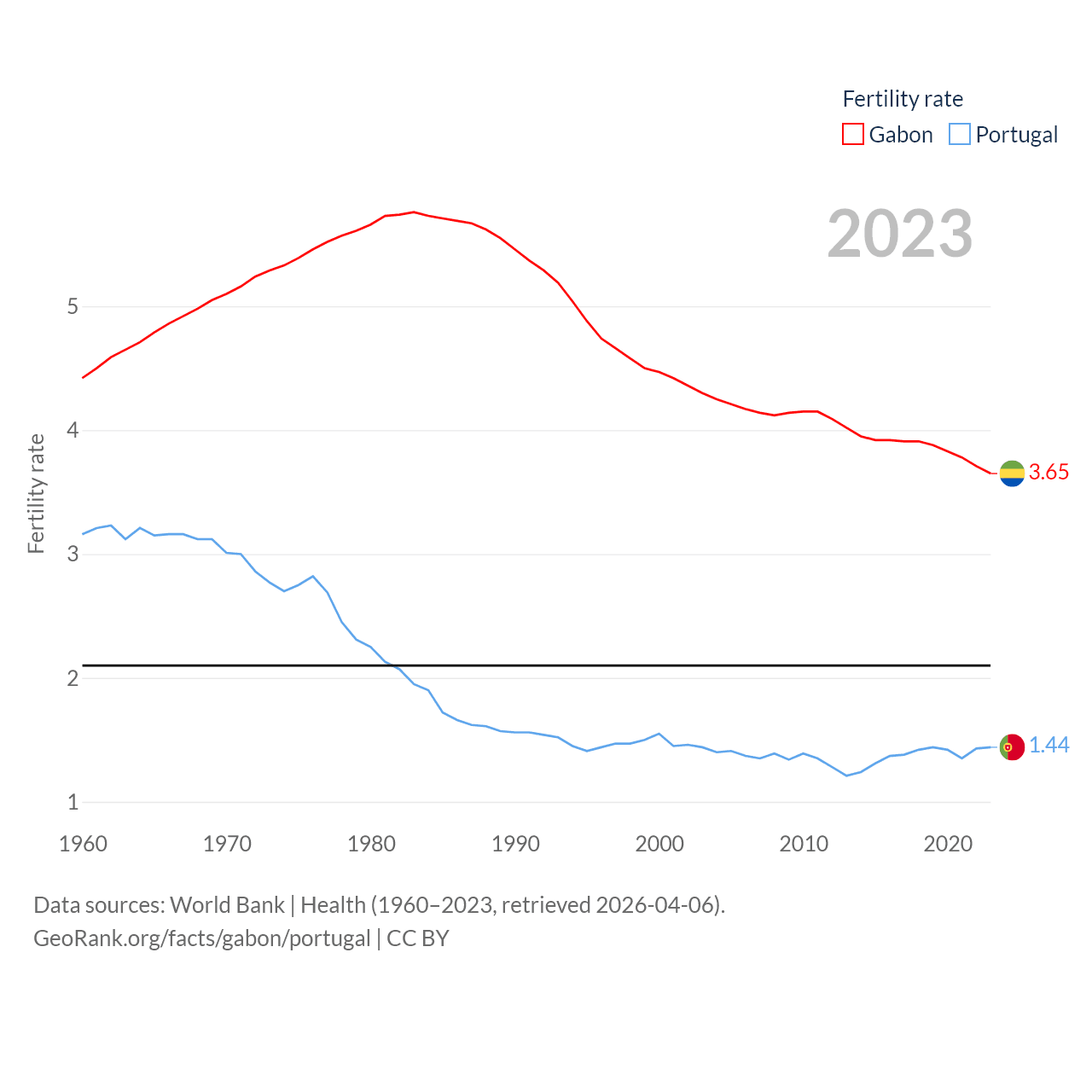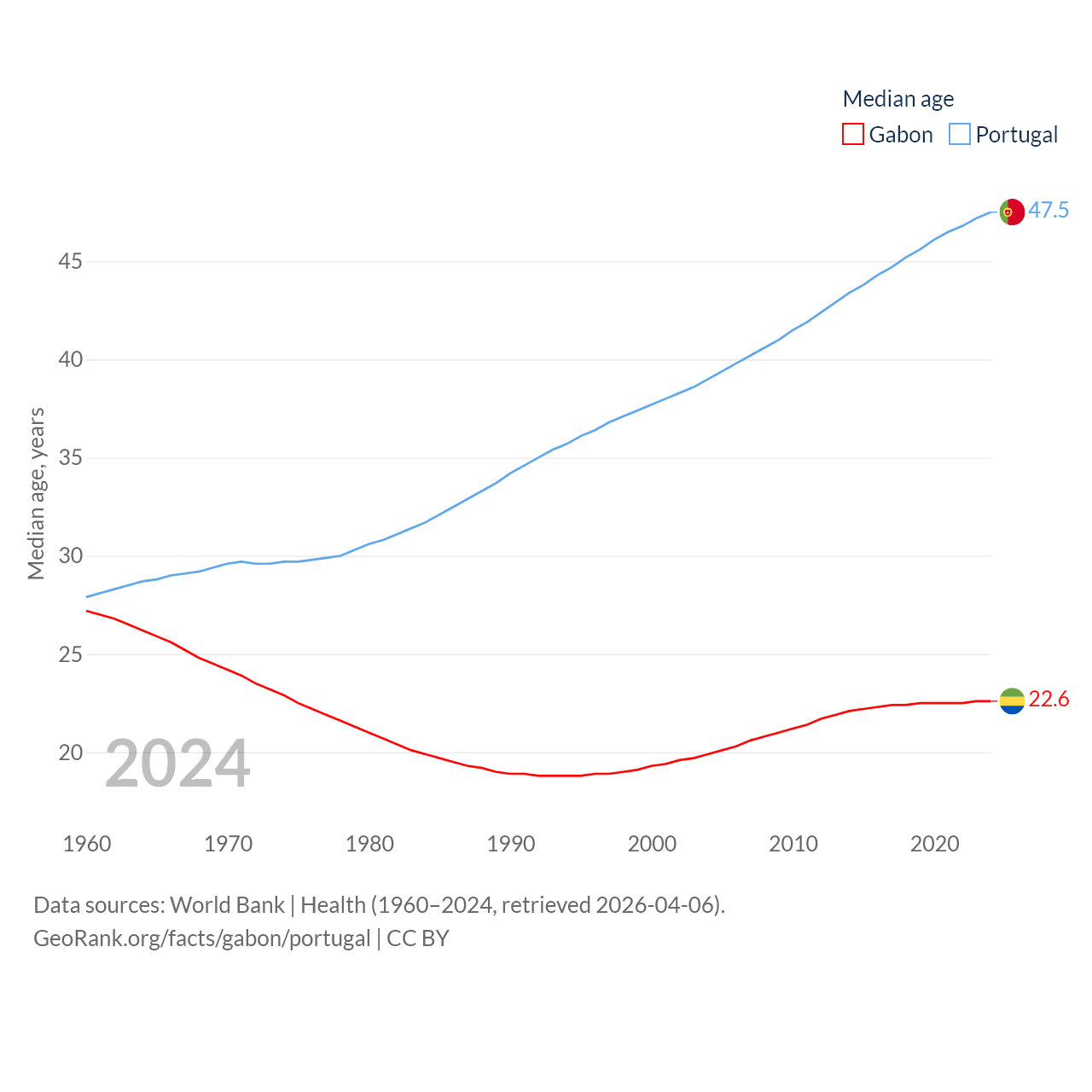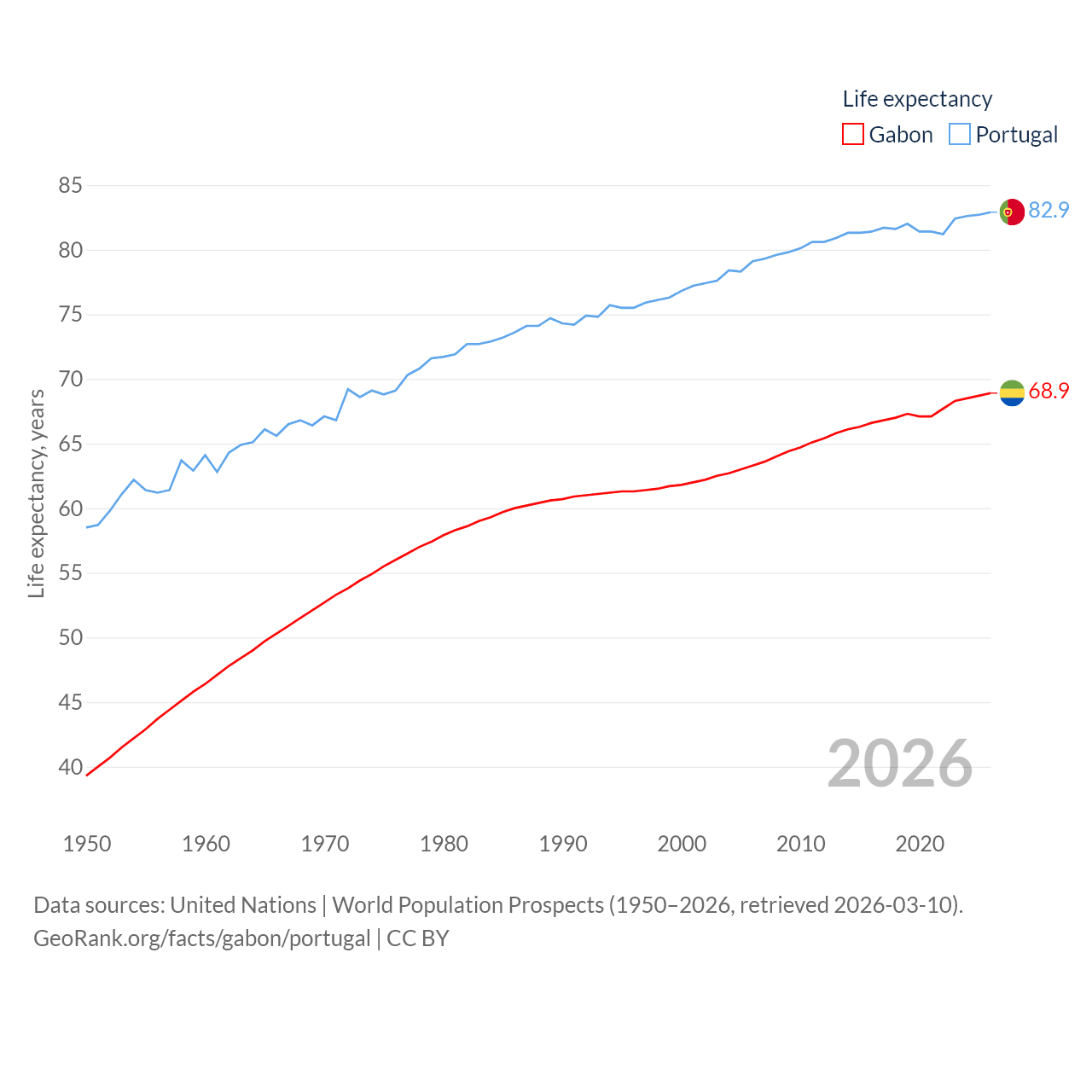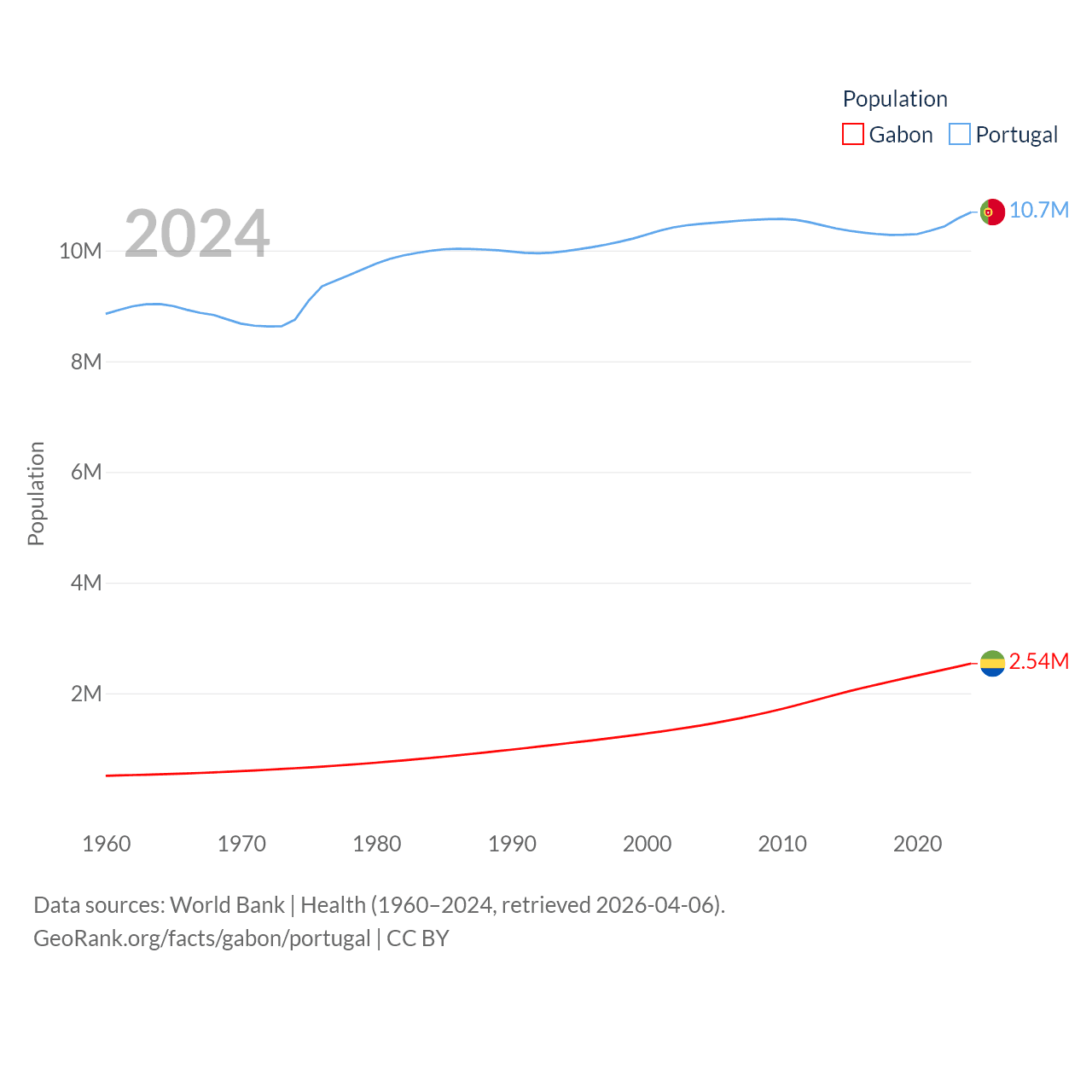 Gabon has a population of 2.54M (ranked 141/197), compared with 10.7M in Portugal (ranked 90/197). Gabon's land area is 99,487 sq mi versus 35,369 sq mi for Portugal (ranked 75th vs. 108th).