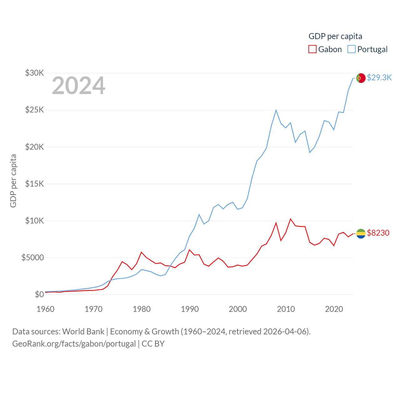 By GDP, Gabon ranks 127/197 ($20.9B) and Portugal ranks 46/197 ($313B). By GDP per capita, Gabon ranks 93/197 ($8,230), while Portugal ranks 44/197 ($29,292).