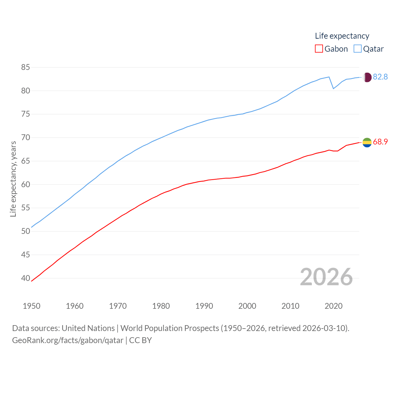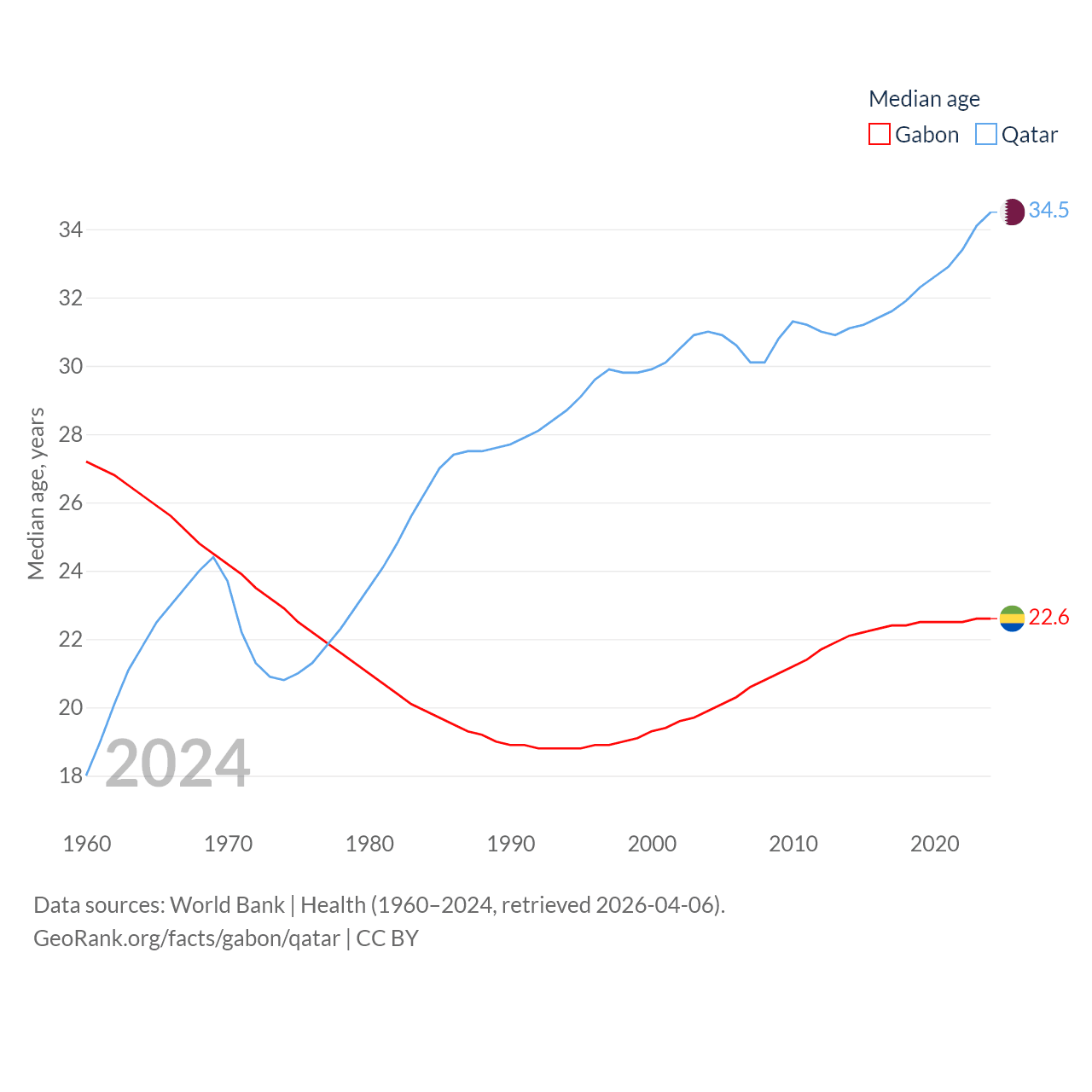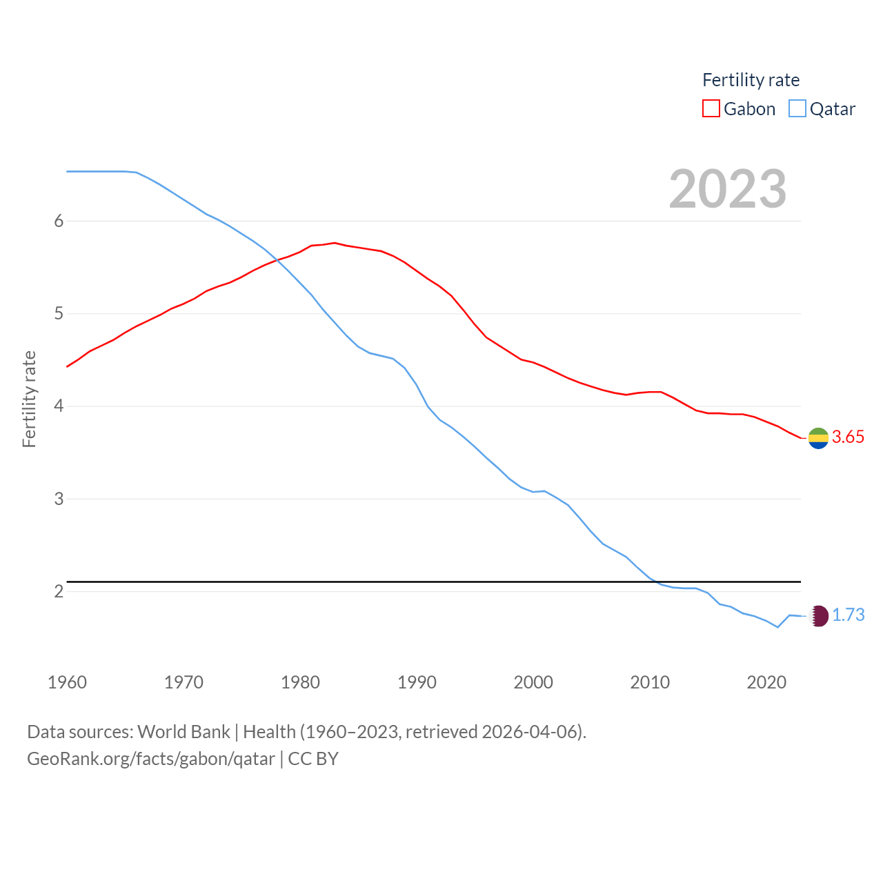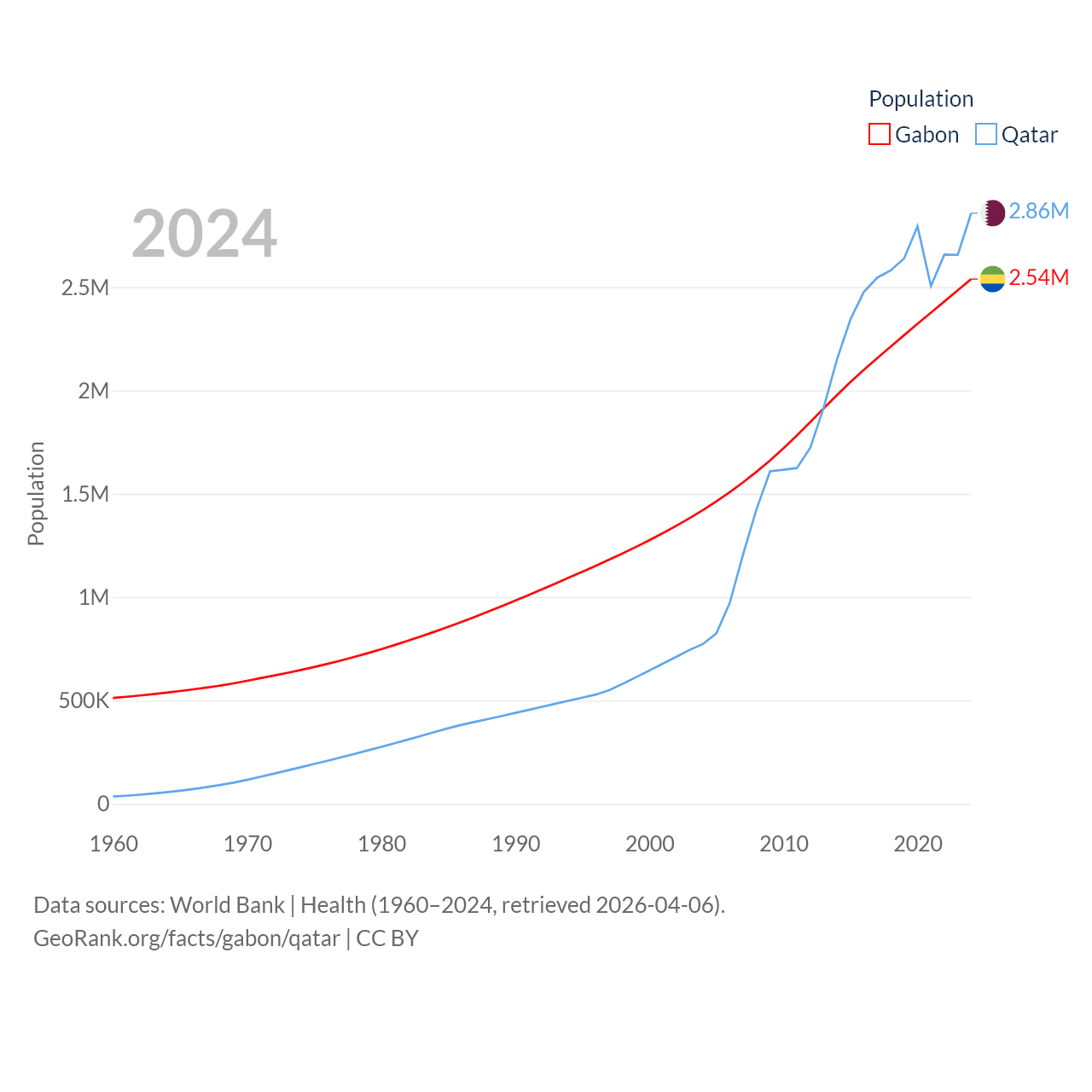 Gabon has a population of 2.54M (ranked 141/197), compared with 2.86M in Qatar (ranked 138/197). Gabon's land area is 99,487 sq mi versus 4,436 sq mi for Qatar (ranked 75th vs. 158th).