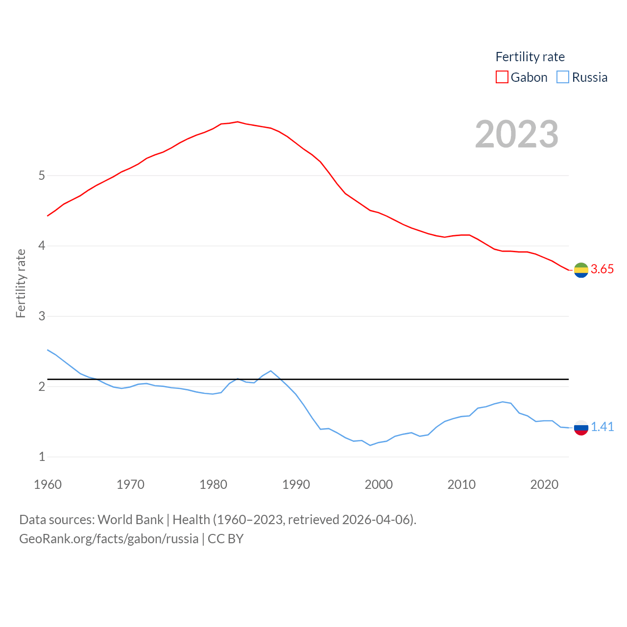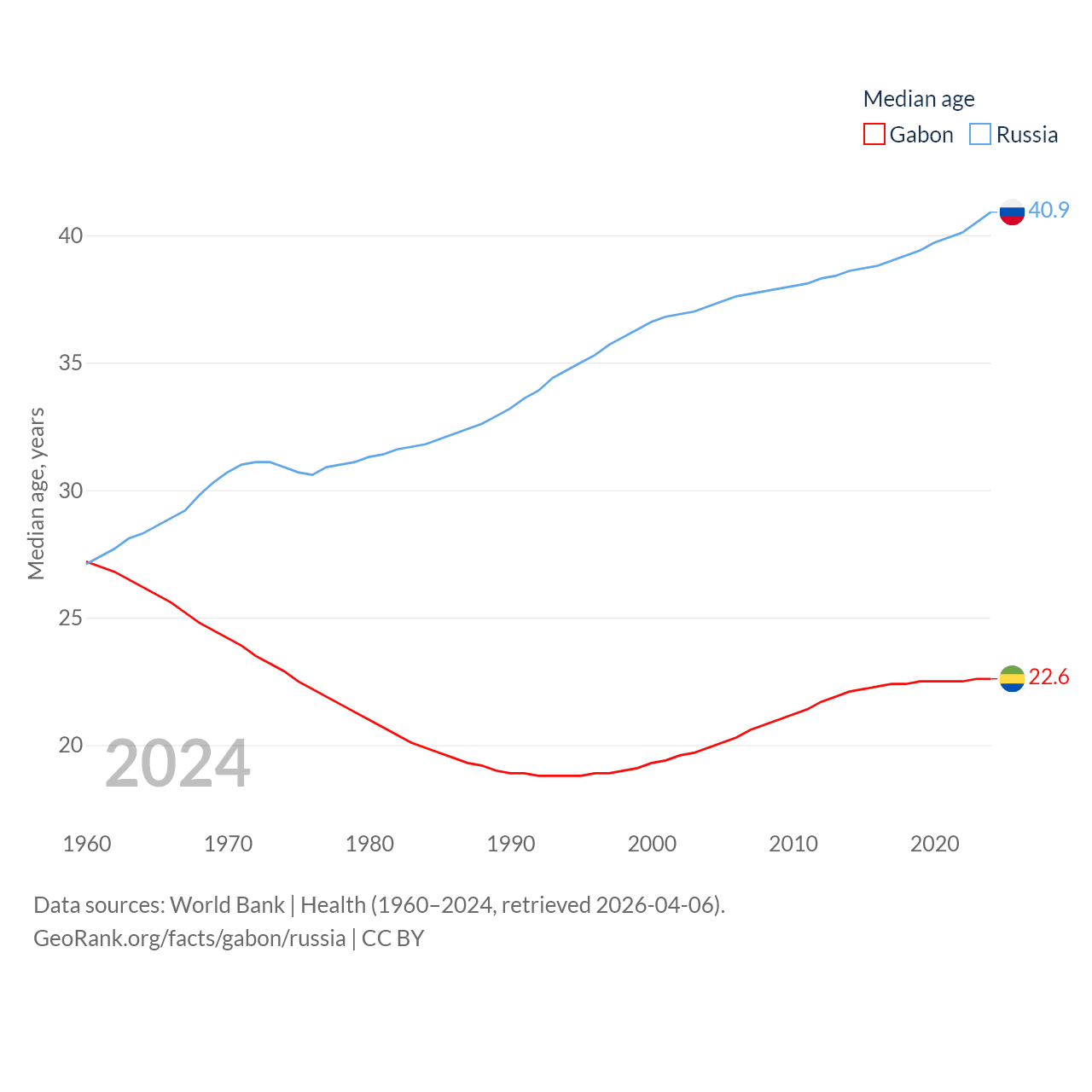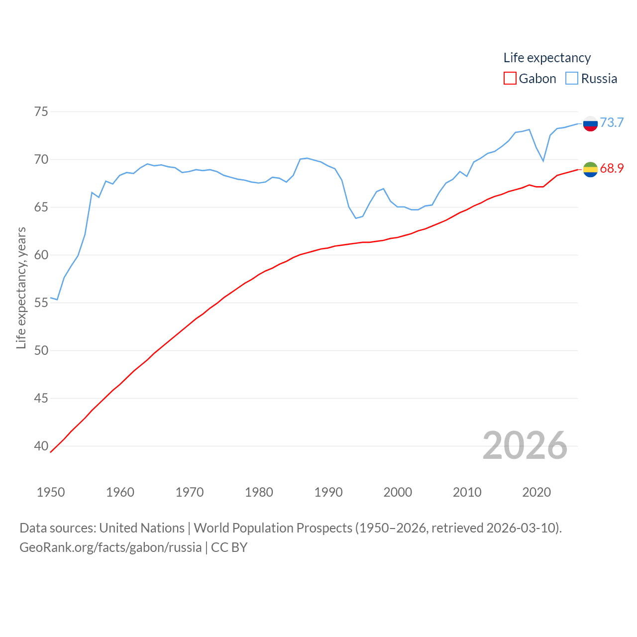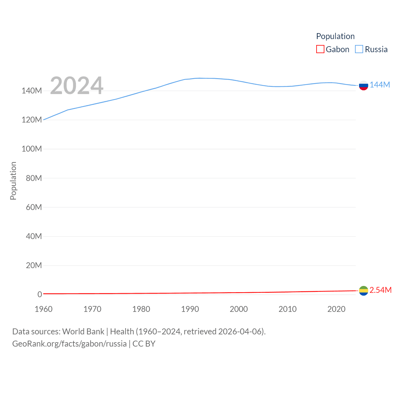 Gabon has a population of 2.54M (ranked 141/197), compared with 144M in Russia (ranked 9/197). Gabon's land area is 99,487 sq mi versus 6,323,145 sq mi for Russia (ranked 75th vs. 1st).