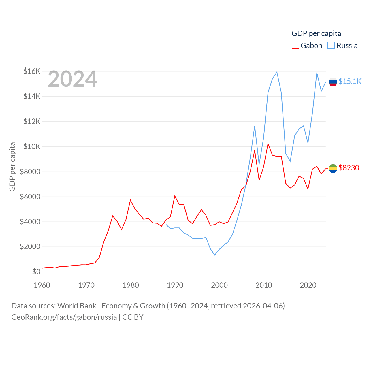 By GDP, Gabon ranks 127/197 ($20.9B) and Russia ranks 11/197 ($2.17T). By GDP per capita, Gabon ranks 93/197 ($8,230), while Russia ranks 68/197 ($15,145).