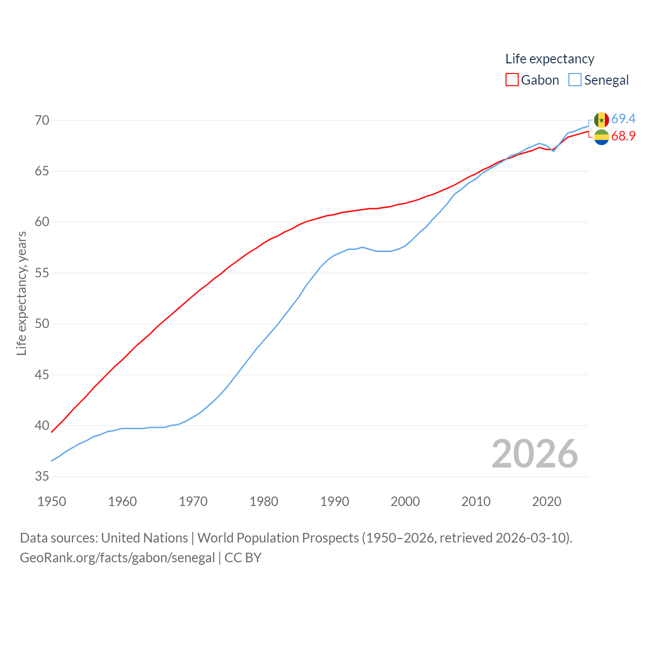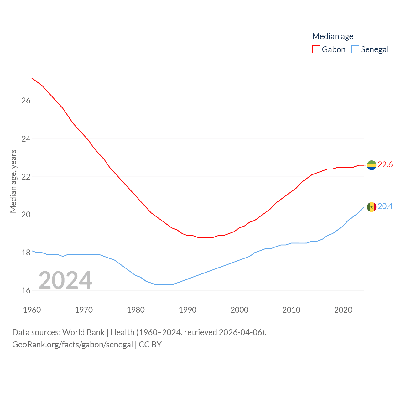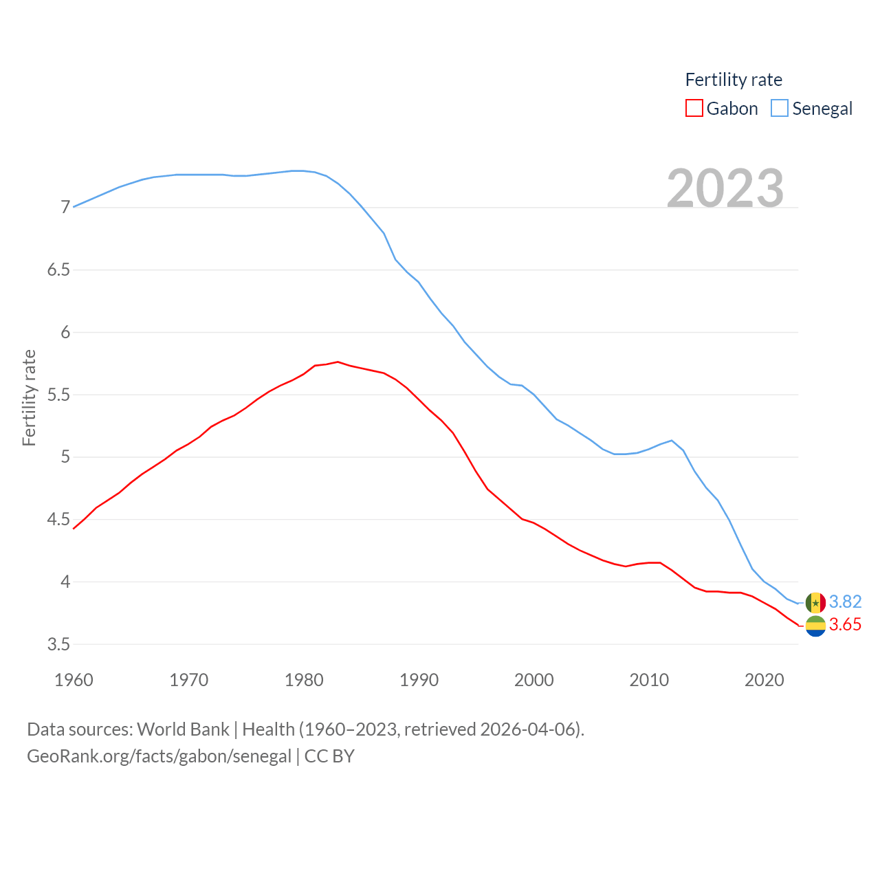 Gabon has a population of 2.54M (ranked 141/197), compared with 18.5M in Senegal (ranked 69/197). Gabon's land area is 99,487 sq mi versus 74,336 sq mi for Senegal (ranked 75th vs. 85th).