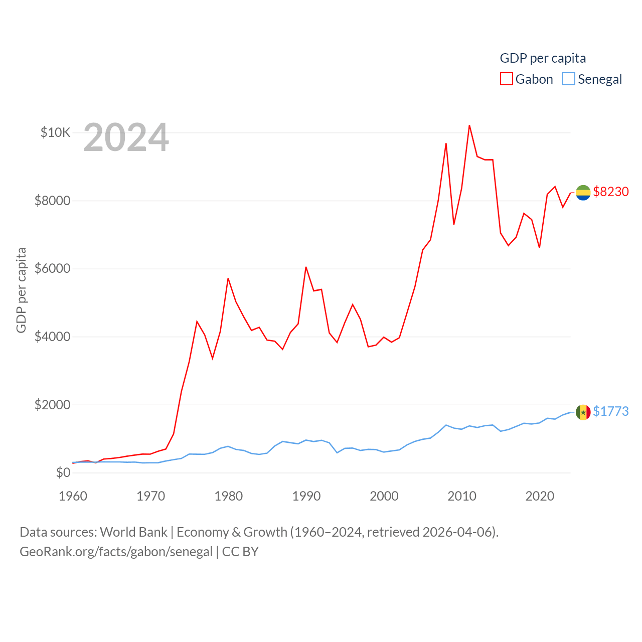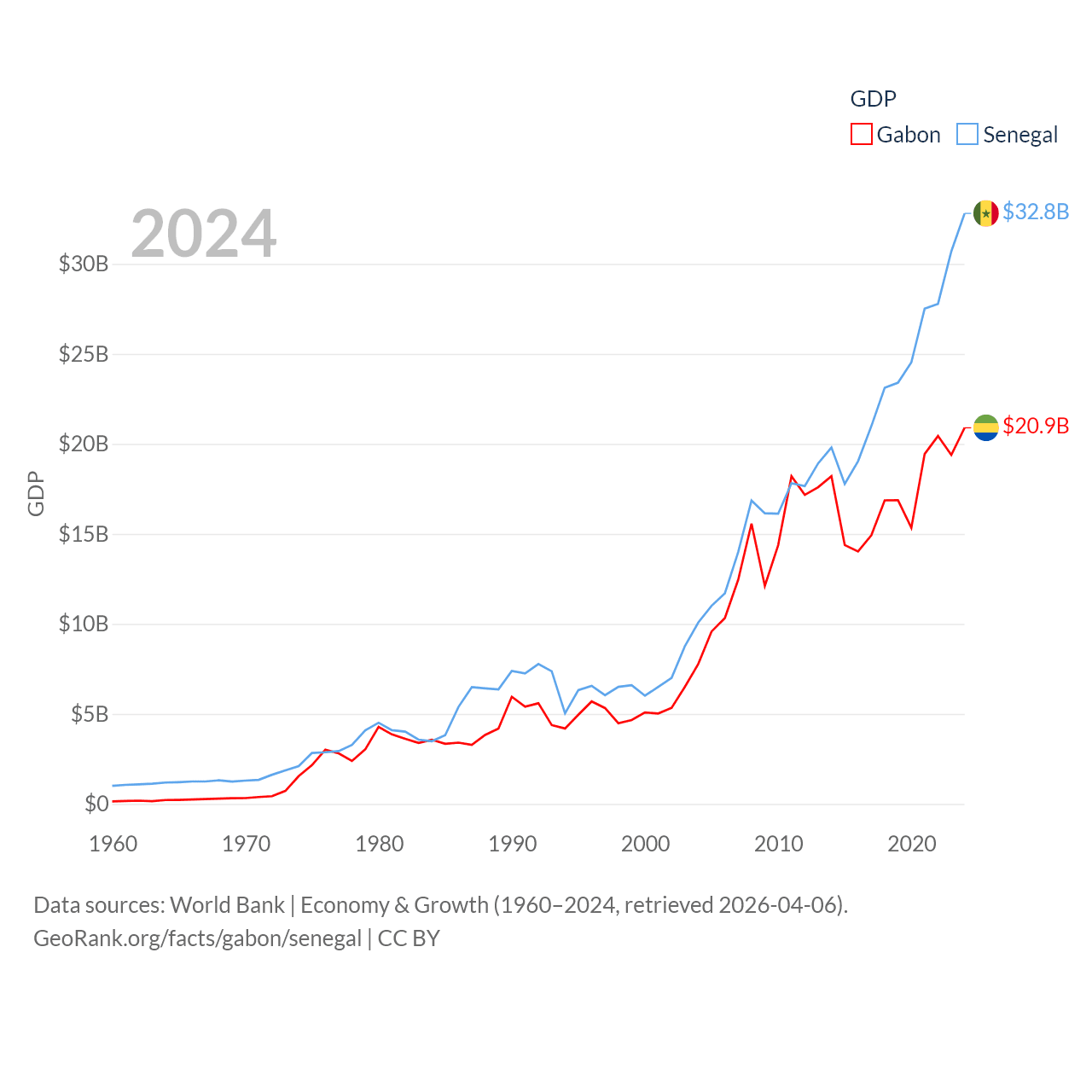 By GDP, Gabon ranks 127/197 ($20.9B) and Senegal ranks 109/197 ($32.8B). By GDP per capita, Gabon ranks 93/197 ($8,230), while Senegal ranks 159/197 ($1,773).