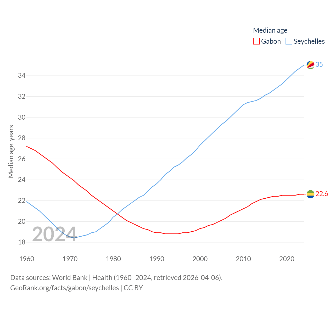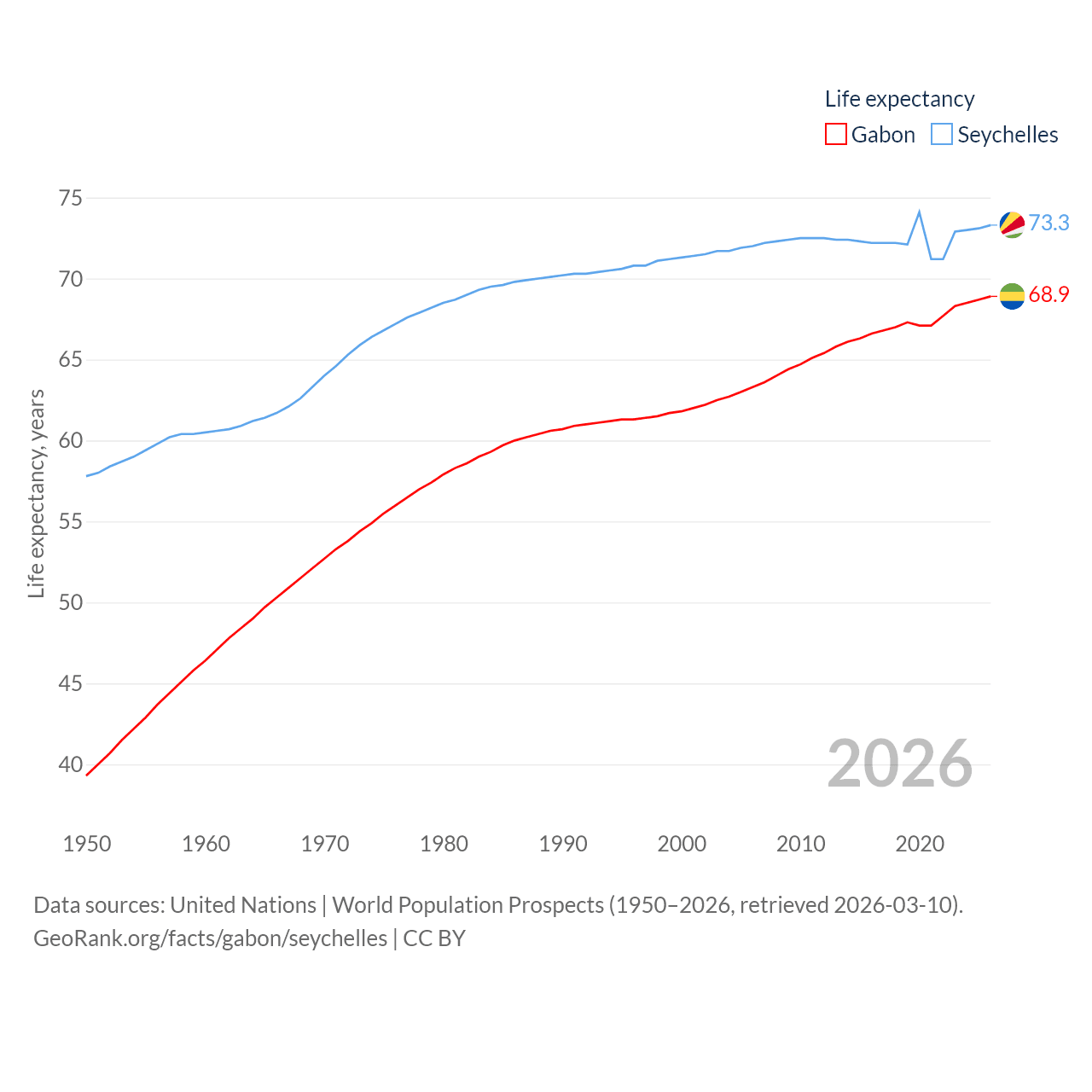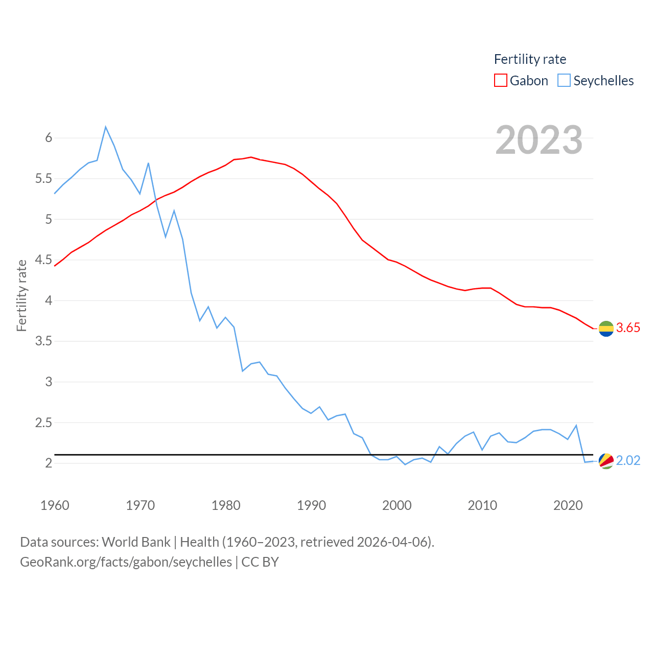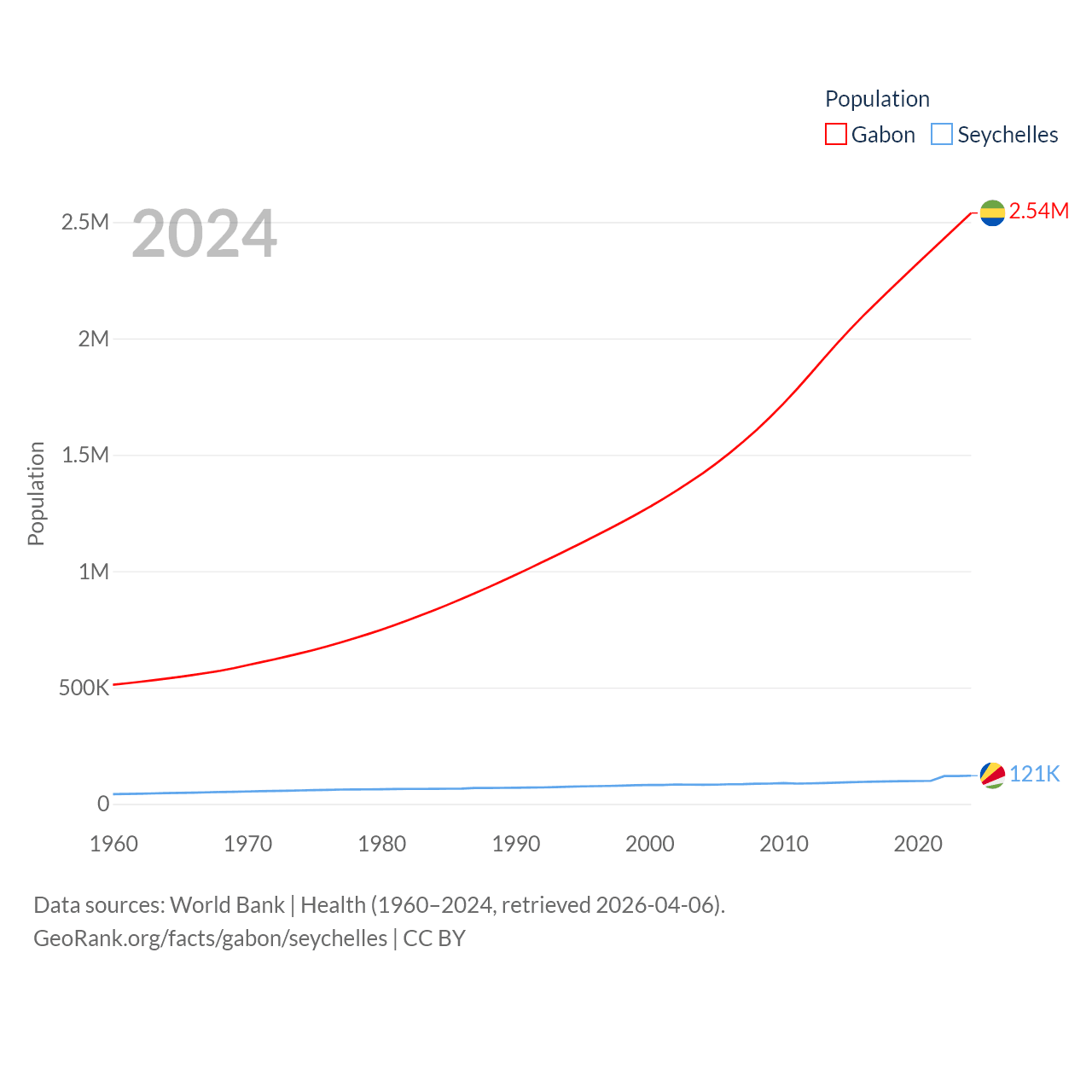 Gabon has a population of 2.54M (ranked 141/197), compared with 121K in The Seychelles (ranked 181/197). Gabon's land area is 99,487 sq mi versus 177.6 sq mi for The Seychelles (ranked 75th vs. 181st).