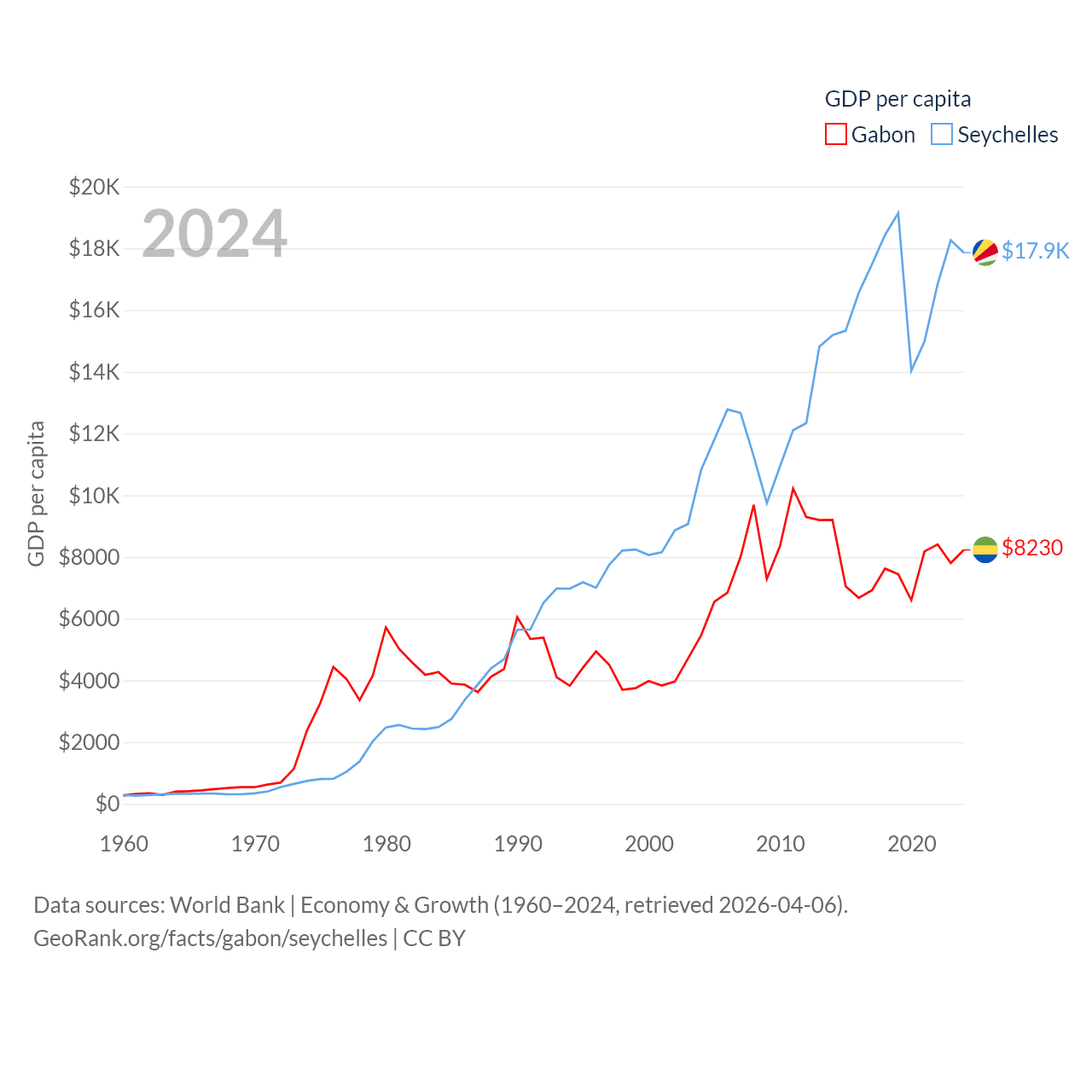 By GDP, Gabon ranks 127/197 ($20.9B) and The Seychelles ranks 178/197 ($2.17B). By GDP per capita, Gabon ranks 93/197 ($8,230), while The Seychelles ranks 63/197 ($17,859).