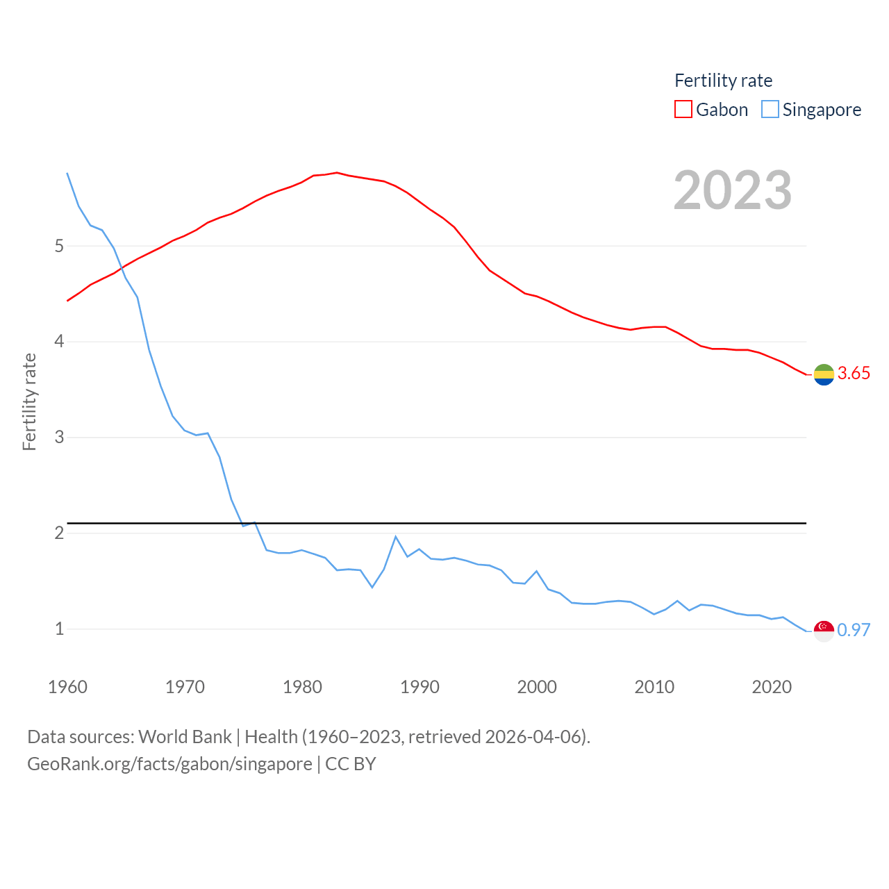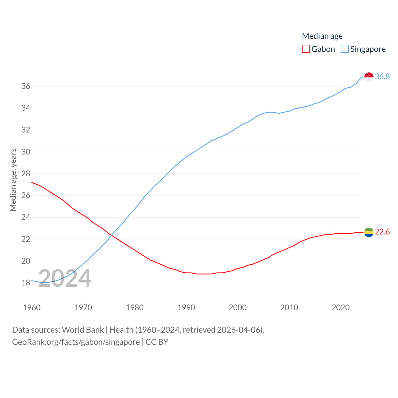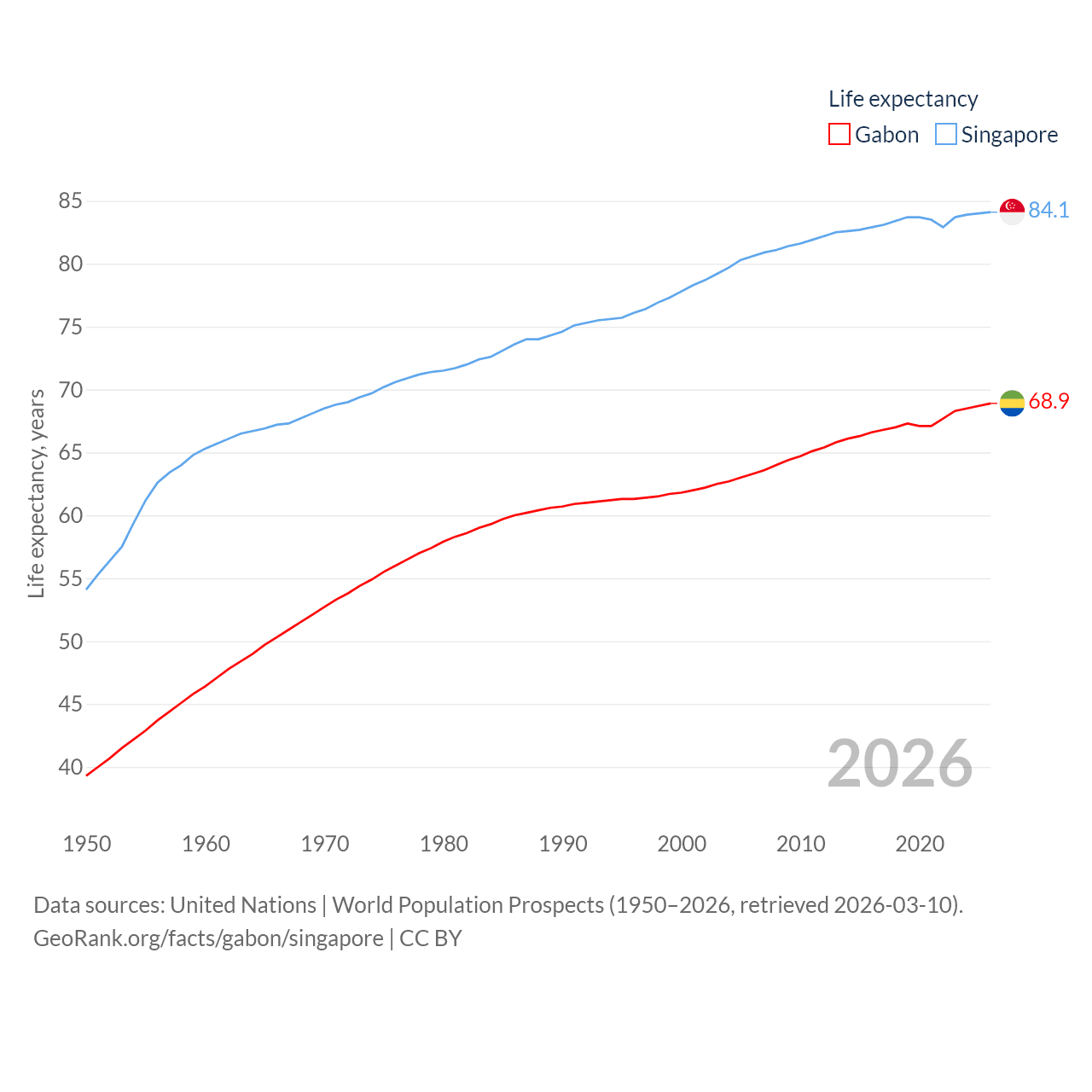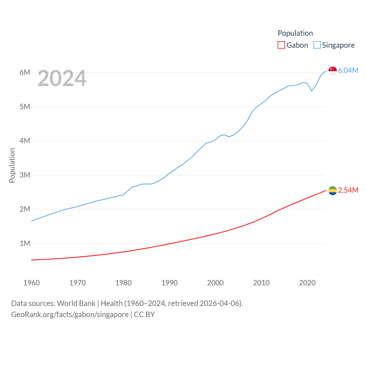 Gabon has a population of 2.54M (ranked 141/197), compared with 6.04M in Singapore (ranked 113/197). Gabon's land area is 99,487 sq mi versus 277.2 sq mi for Singapore (ranked 75th vs. 177th).