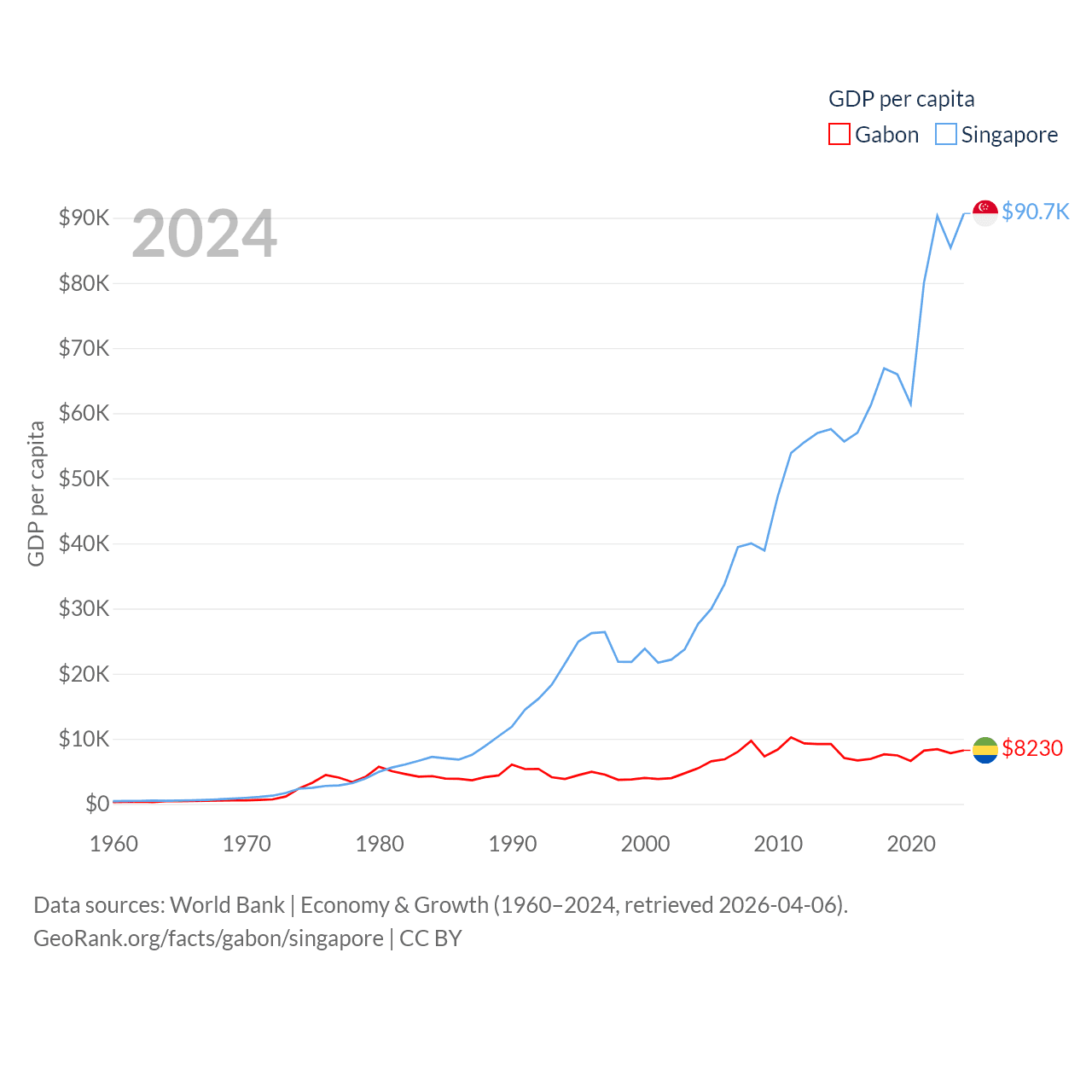 By GDP, Gabon ranks 127/197 ($20.9B) and Singapore ranks 28/197 ($547B). By GDP per capita, Gabon ranks 93/197 ($8,230), while Singapore ranks 7/197 ($90,674).