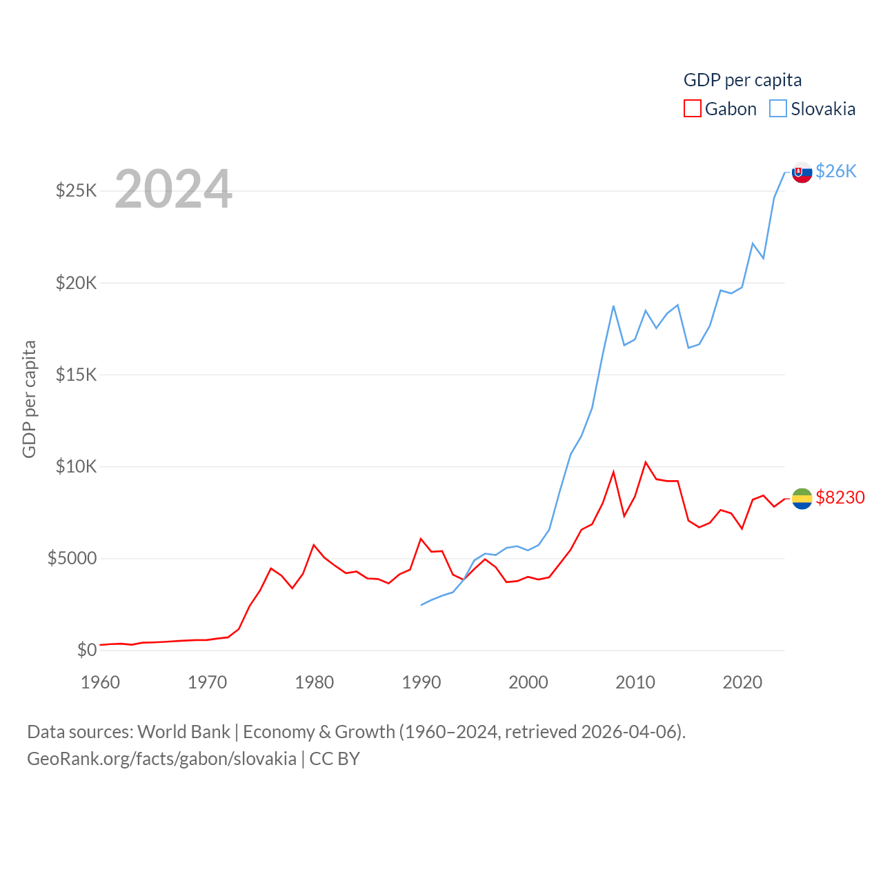 By GDP, Gabon ranks 127/197 ($20.9B) and Slovakia ranks 61/197 ($141B). By GDP per capita, Gabon ranks 93/197 ($8,230), while Slovakia ranks 47/197 ($25,993).
