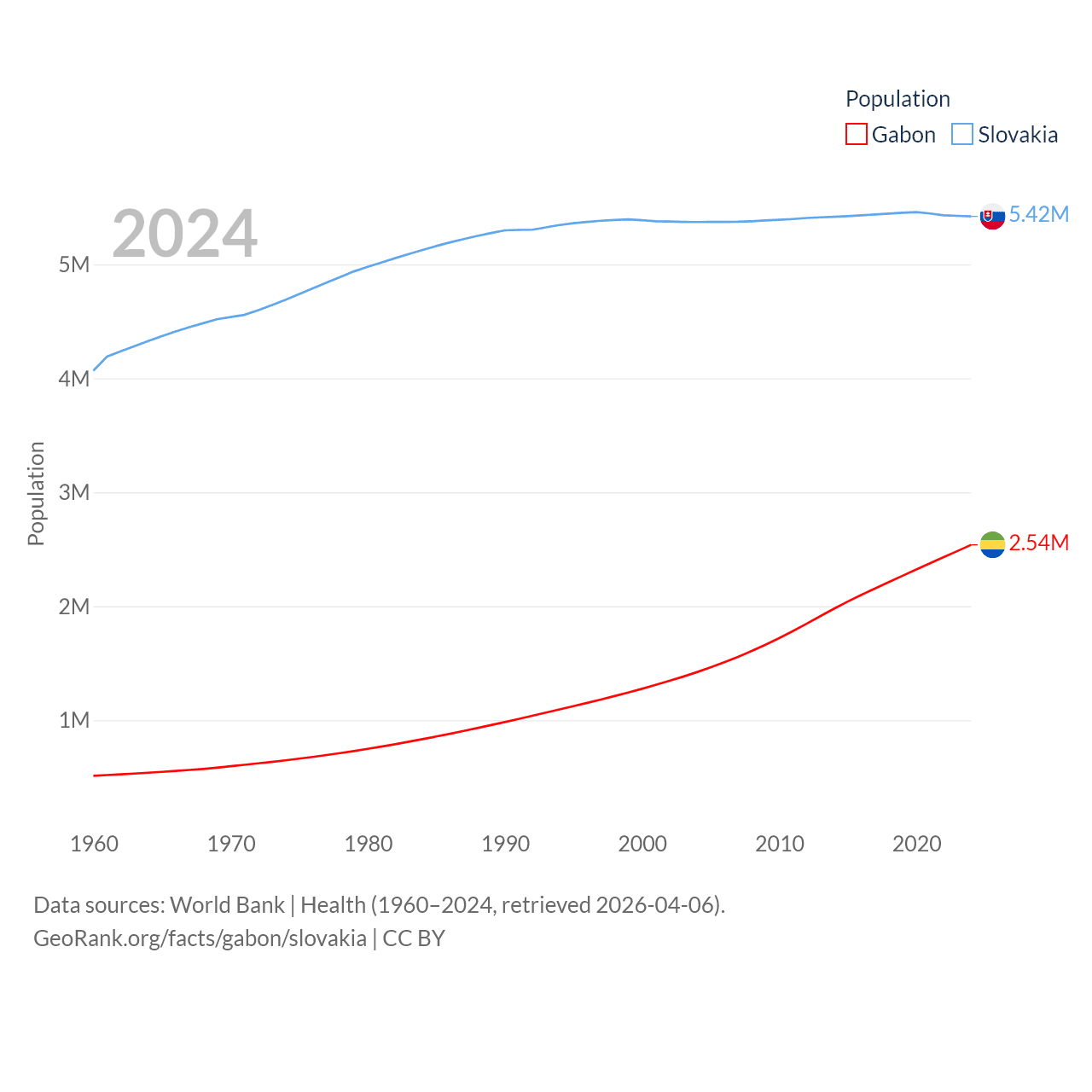 Gabon has a population of 2.54M (ranked 141/197), compared with 5.42M in Slovakia (ranked 119/197). Gabon's land area is 99,487 sq mi versus 18,564 sq mi for Slovakia (ranked 75th vs. 128th).