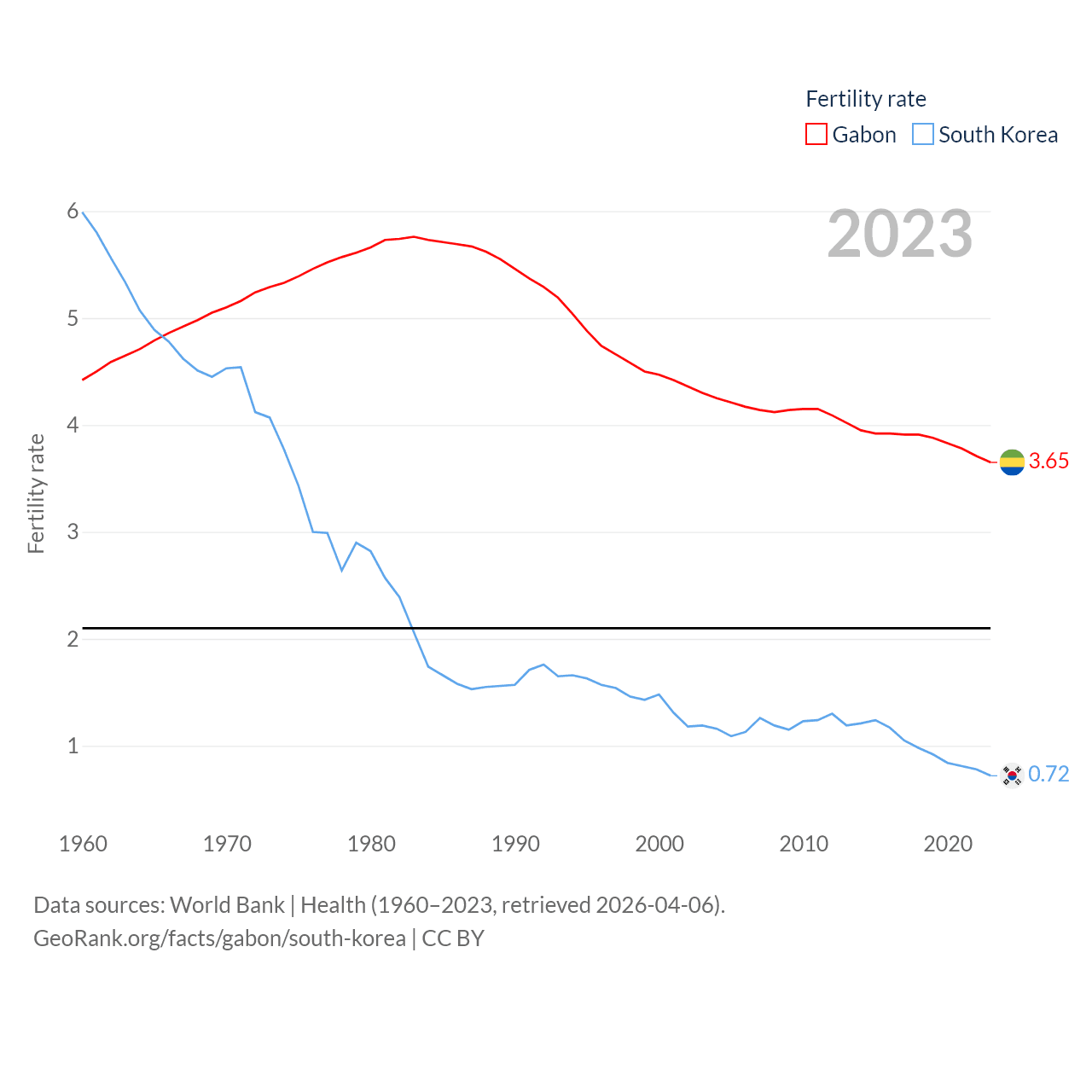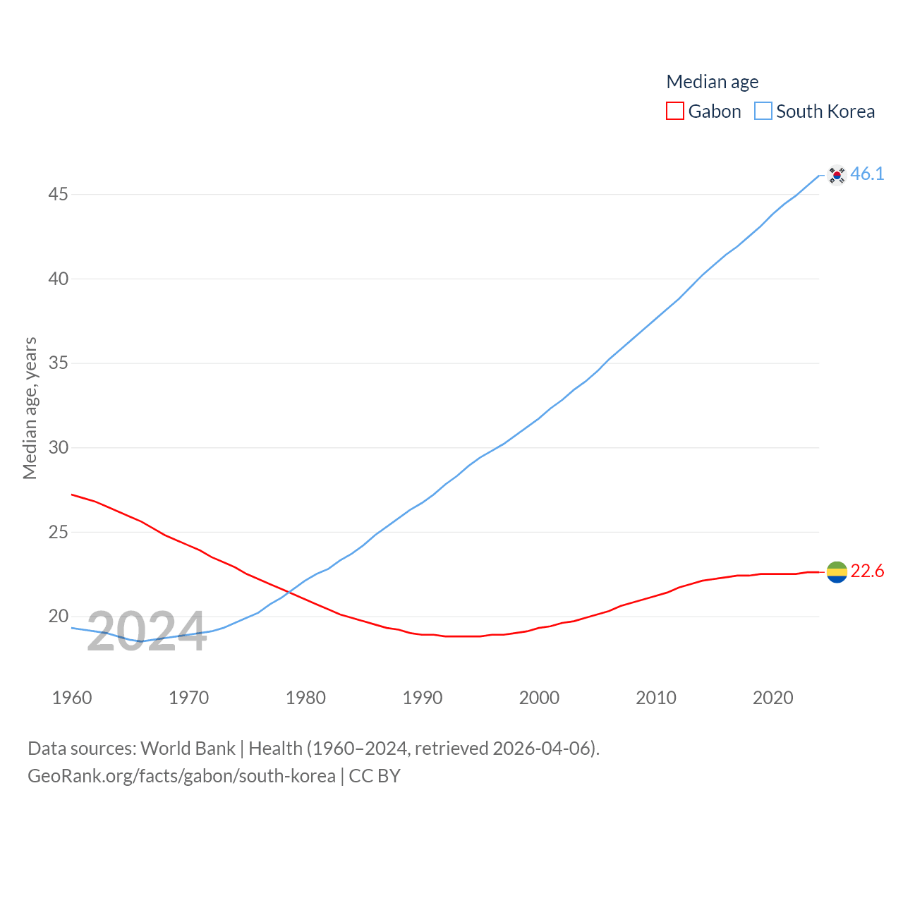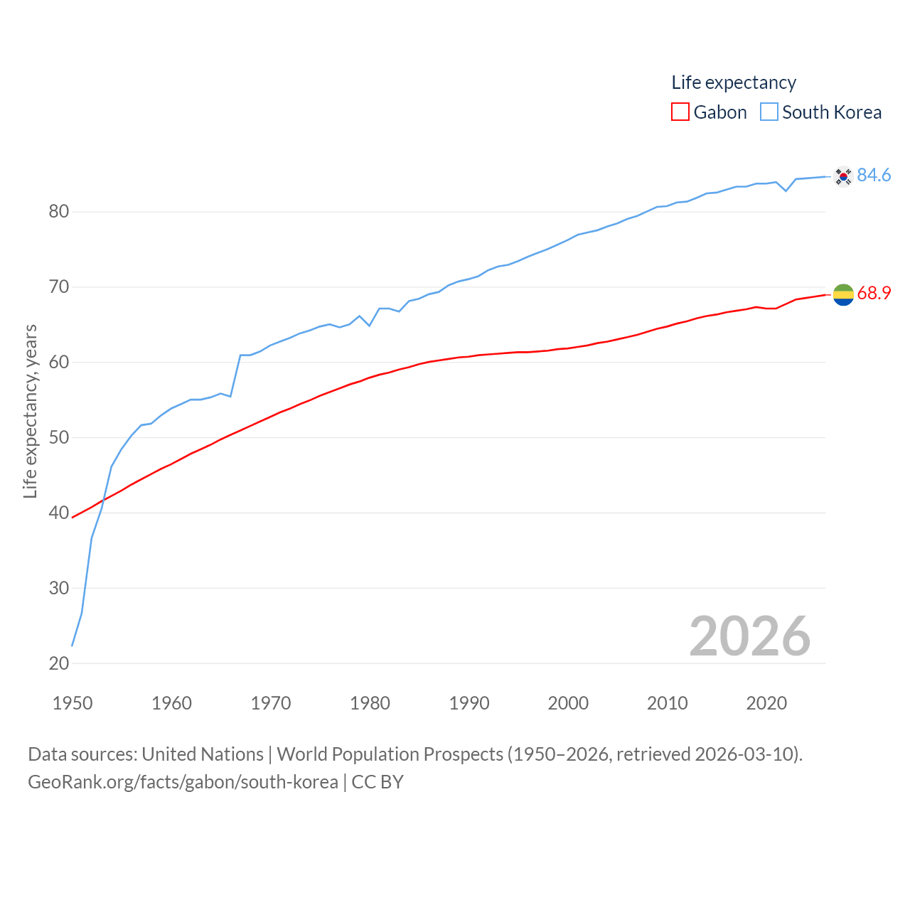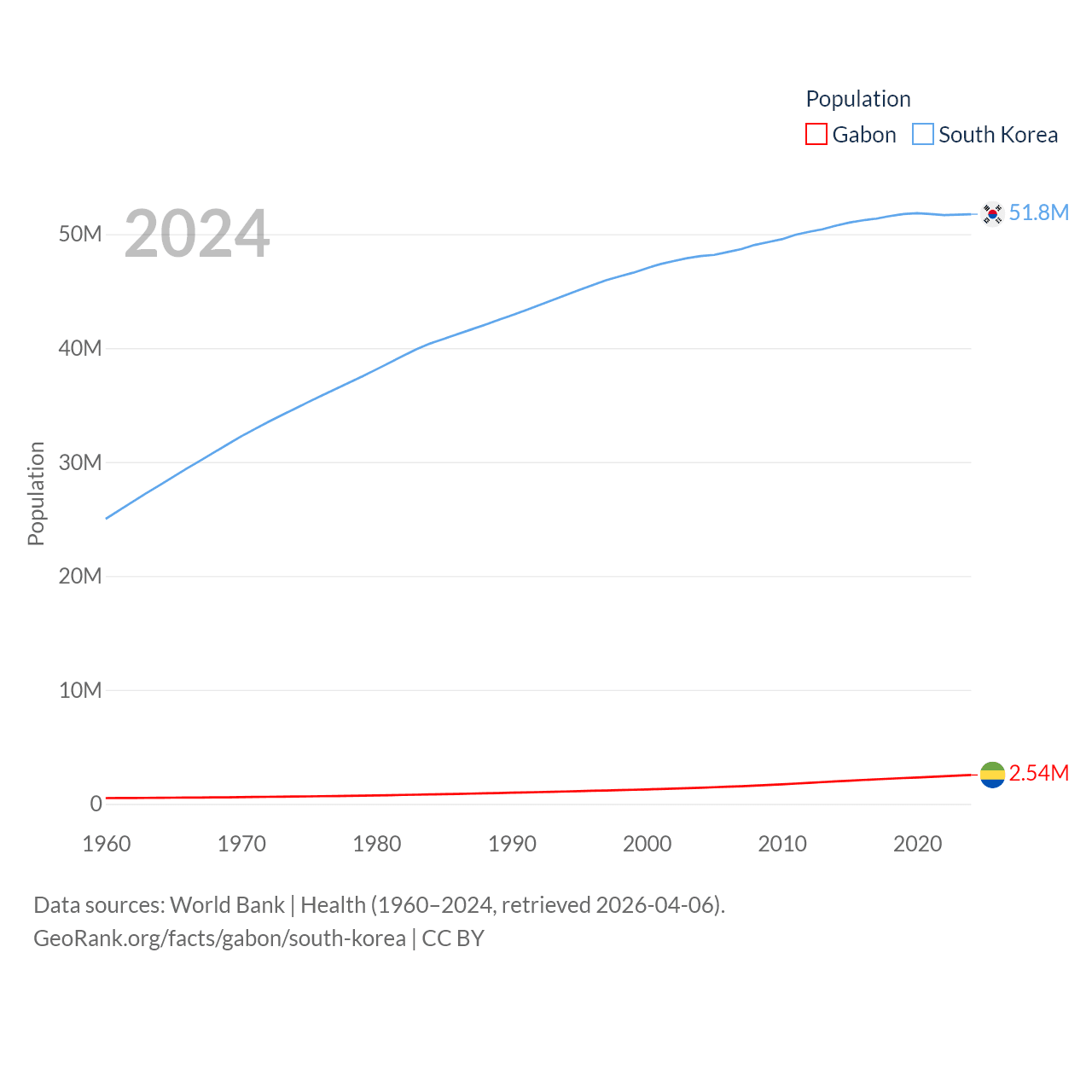 Gabon has a population of 2.54M (ranked 141/197), compared with 51.8M in South Korea (ranked 29/197). Gabon's land area is 99,487 sq mi versus 37,684 sq mi for South Korea (ranked 75th vs. 105th).